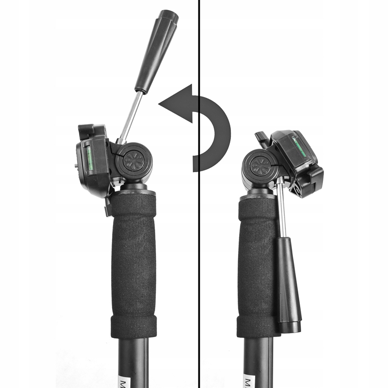 Верхня частина об'ємної головки монопода з рівнем (дозволяє точно вирівняти) і знімним швидкоз'єднувачем зі стандартною різьбою і центруючим штифтом (швидкороз'єм можна швидко зняти за допомогою кліпси або назавжди кріпиться до камери - додаткову частину можна придбати на іншому нашому аукціоні). Голову можна встановити в будь-якому положенні за допомогою зручної ручки - додаткова функція фіксації на 90° дозволяє зручно фотографувати у вертикальному положенні.