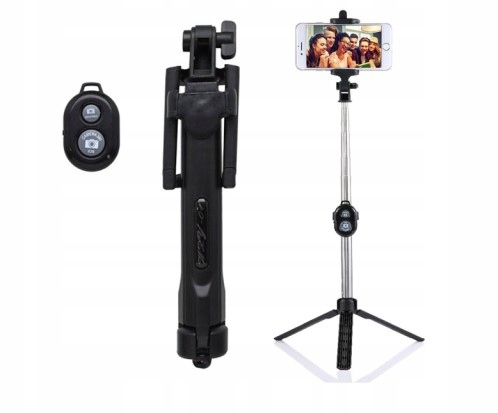Селфі-тримач з пультом дистанційного керування Bluetooth Штатив підключається до телефону через Bluetooth. Маленький пульт дистанційного керування дозволяє робити фотографії з великої відстані. Пристрій має три складні ніжки, які забезпечують стійкість під час фотозйомки. Тримач надзвичайно інтуїтивно зрозумілий, має регулювання довжини та головку, що обертається на 360 градусів, що дозволяє легко розмістити телефон у зручному положенні. Завдяки невеликим розмірам у складеному стані пристрій ідеально підходить для подорожей.