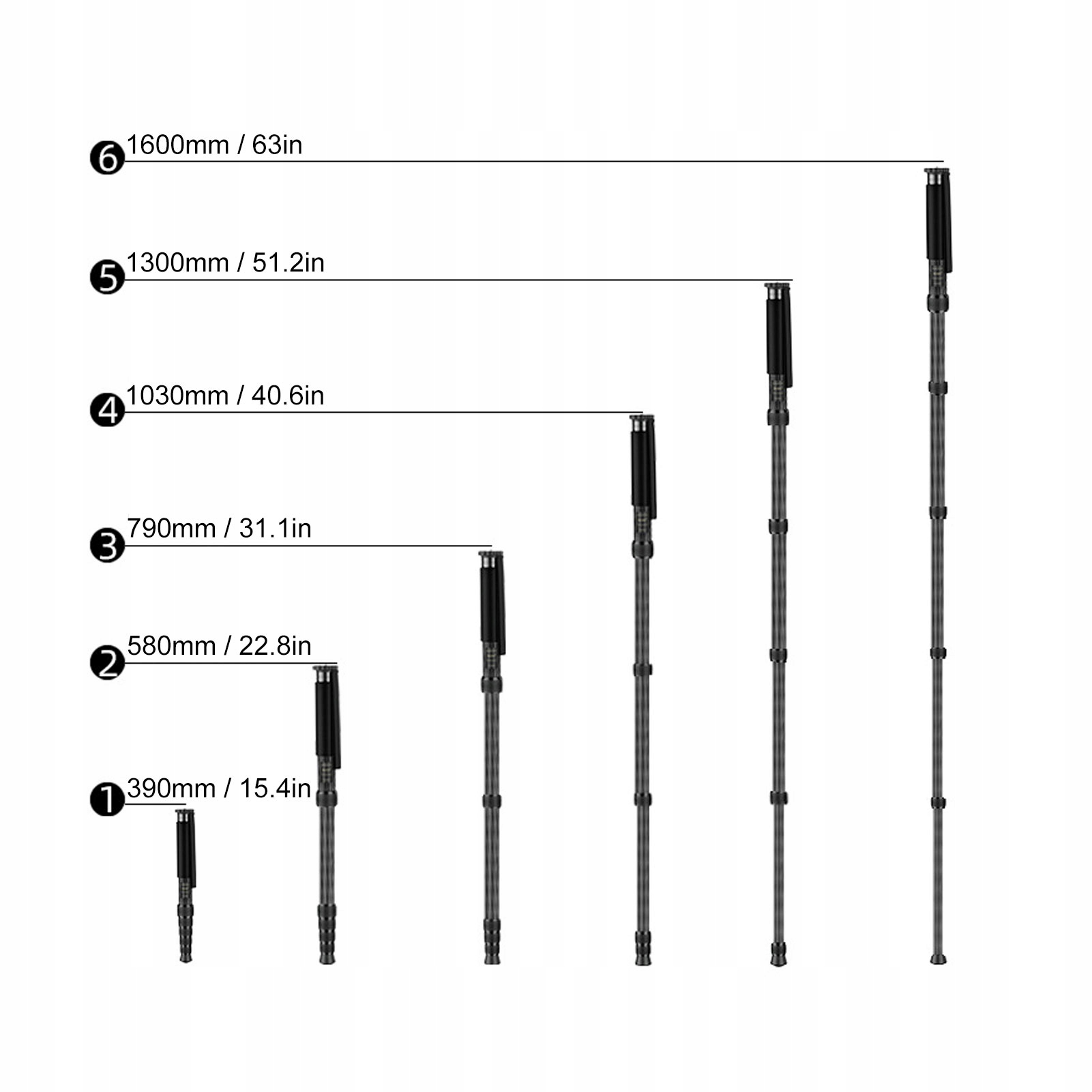 1. Регульована висота: Цей монопод має 6 розділів труб для ніг, які можна швидко відкрити, регулюючи поворот, висоту можна відрегулювати для задоволення більшої кількості потреб.