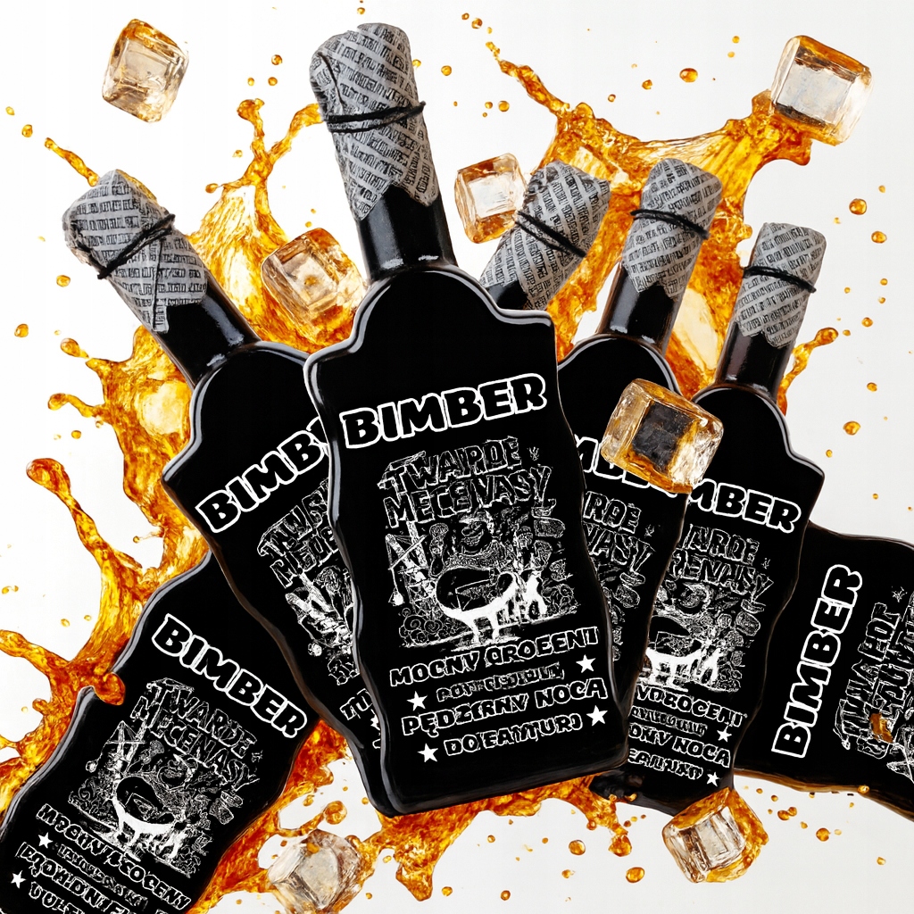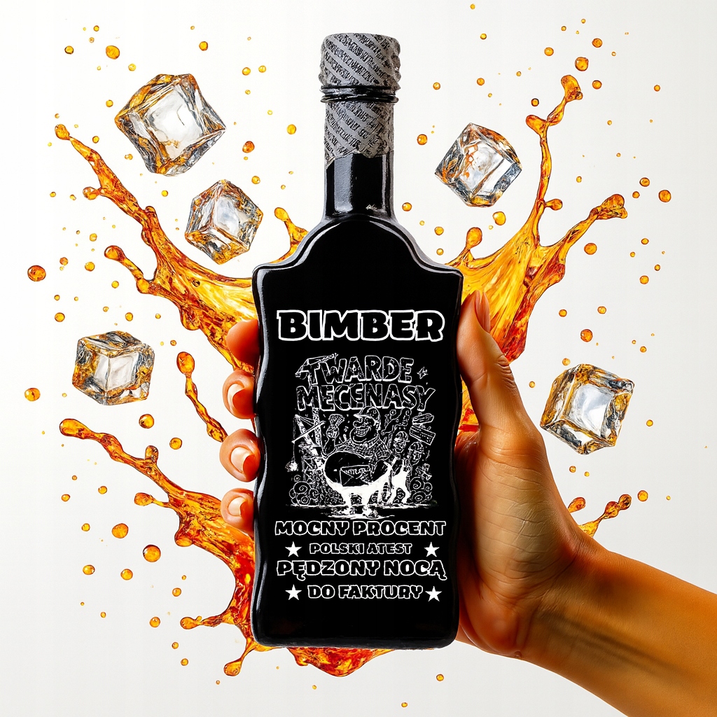 Original Chaos glass 500 ml black with жартівливий принт "Twarde Patrons" - це унікальна пропозиція від Dr. Колекція Bimber. Пляшка має білий трафаретний друк, який є міцним і стійким до стирання, а в набір входить синтетична грибоподібна пробка, паперовий ковпачок з написами BIMBER і гумка.