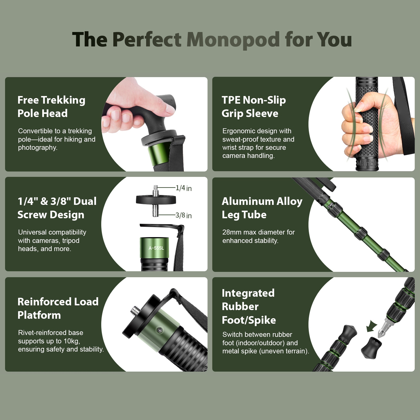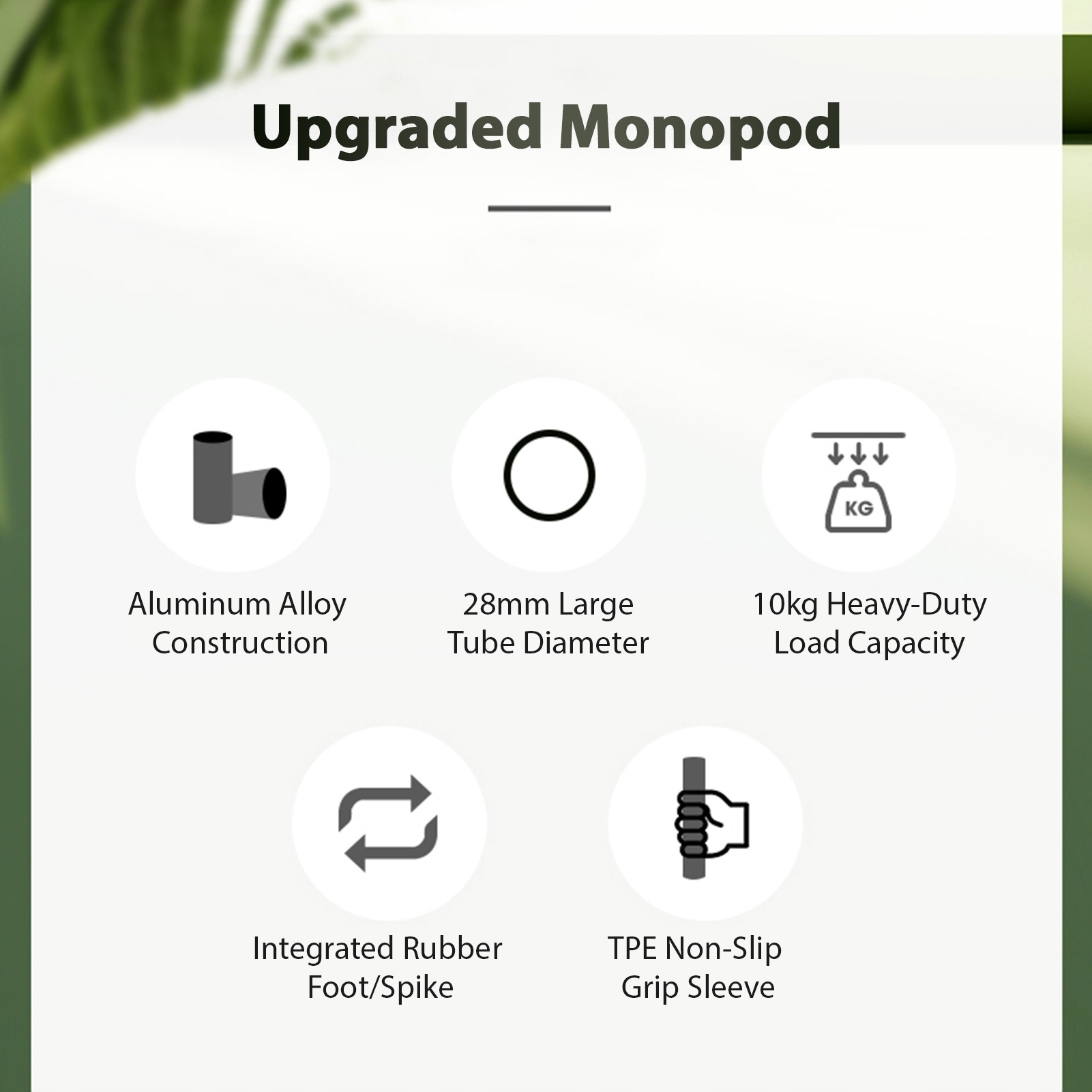 1. Світло та портативна: вагою всього 0,49 кг і досить компактним, щоб поміститися в сумку, ця підставка для камери призначається для фотографів на ходу. Незалежно від того, ви подорожуєте, зареєструєте спорт дії чи відкриваєте дику природу, цей легкий та портативний монопод камери гарантує, що ви ніколи не пропустите момент, не додаючи зайвої маси для обладнання.
