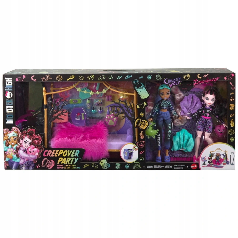 Цей комплект Monster High влаштовує моторошну нічну вечірку. Включає двох ляльок Monster High у зручних і милих костюмах, а також меблі для спальні, закуски та відповідні аксесуари. Завдяки понад 20 аксесуарам діти віком від 4 років можуть створити купу веселих історій для ляльки Клодіна Вульфа та Дракулаури!
