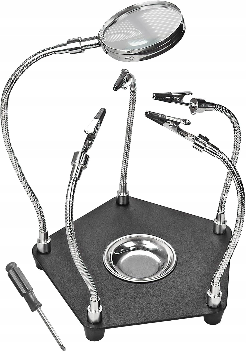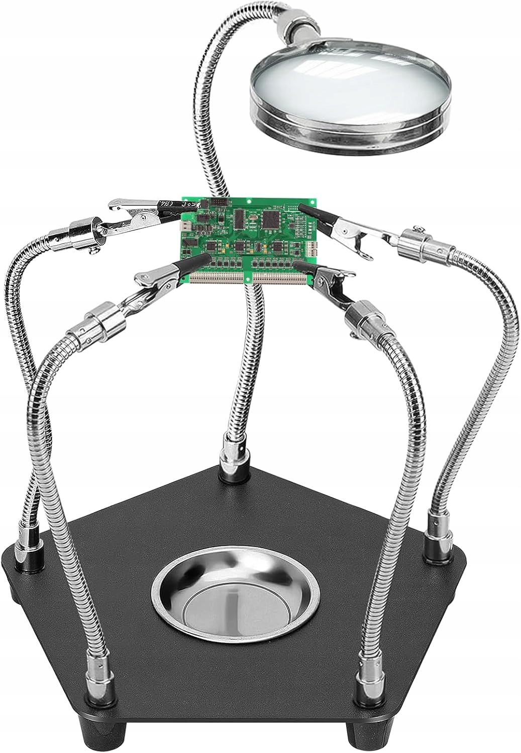 - З гнучким і міцним металевим шлангом і в комплекті з чотирма пайками затискачами та паяльною лупою ви можете легко зафіксувати друковані плати в потрібному положенні.