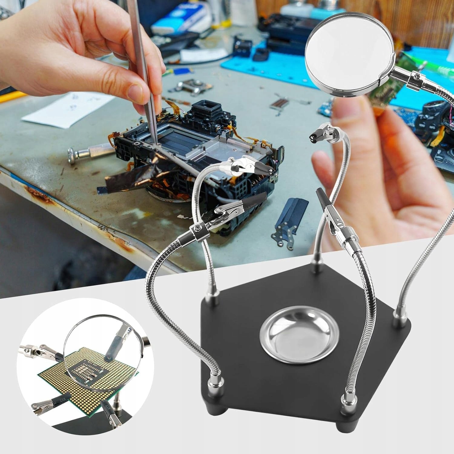 - Паяння трьома руками підходить для будь-якої роботи з електронікою, паяння, рукоділля, малювання, різьблення, хобі чи будь-яких точних проектів, які вимагають надзвичайної точності.