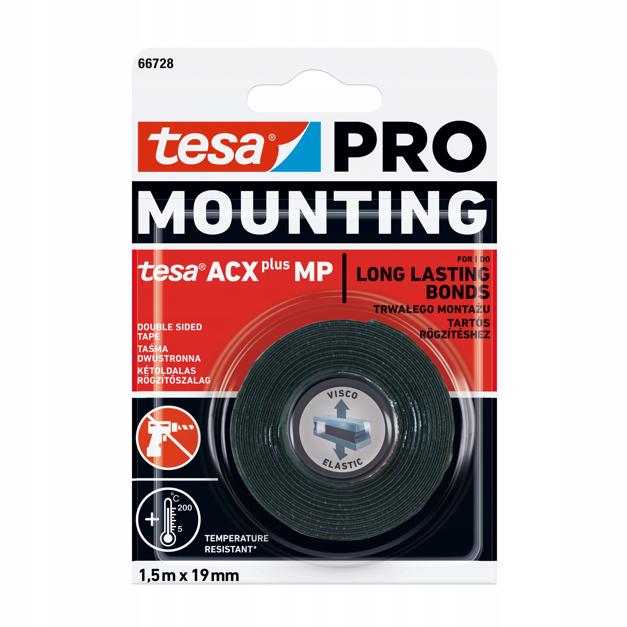 Наш tesa PRO Mounting ACXplus Стрічка MP забезпечує якість промислового рівня. Його інноваційна акрилова піна надзвичайно стійка до вологи, хімікатів, пом’якшувачів та УФ-променів. Це означає, що вам не доведеться турбуватися про довговічність і надійність кріплення.