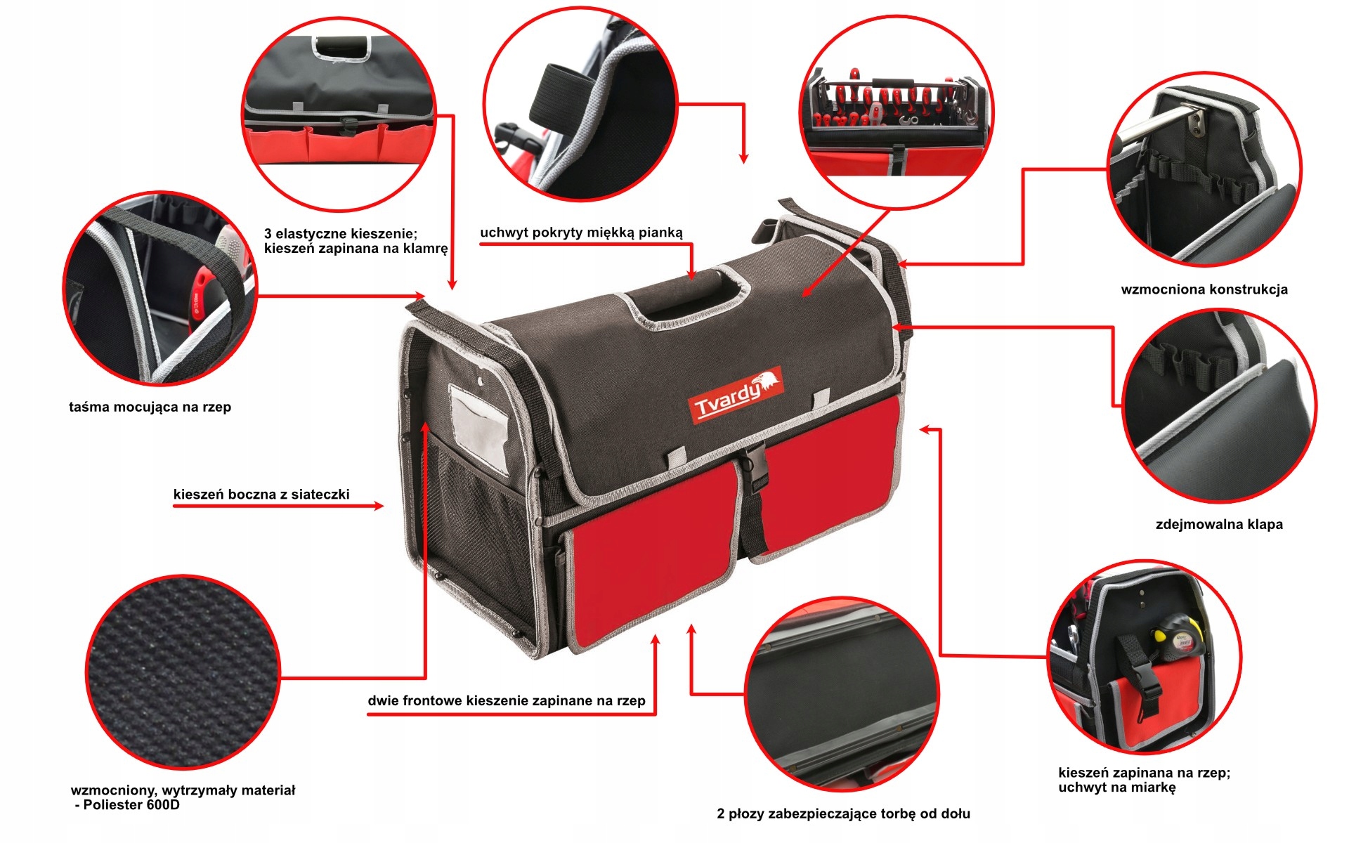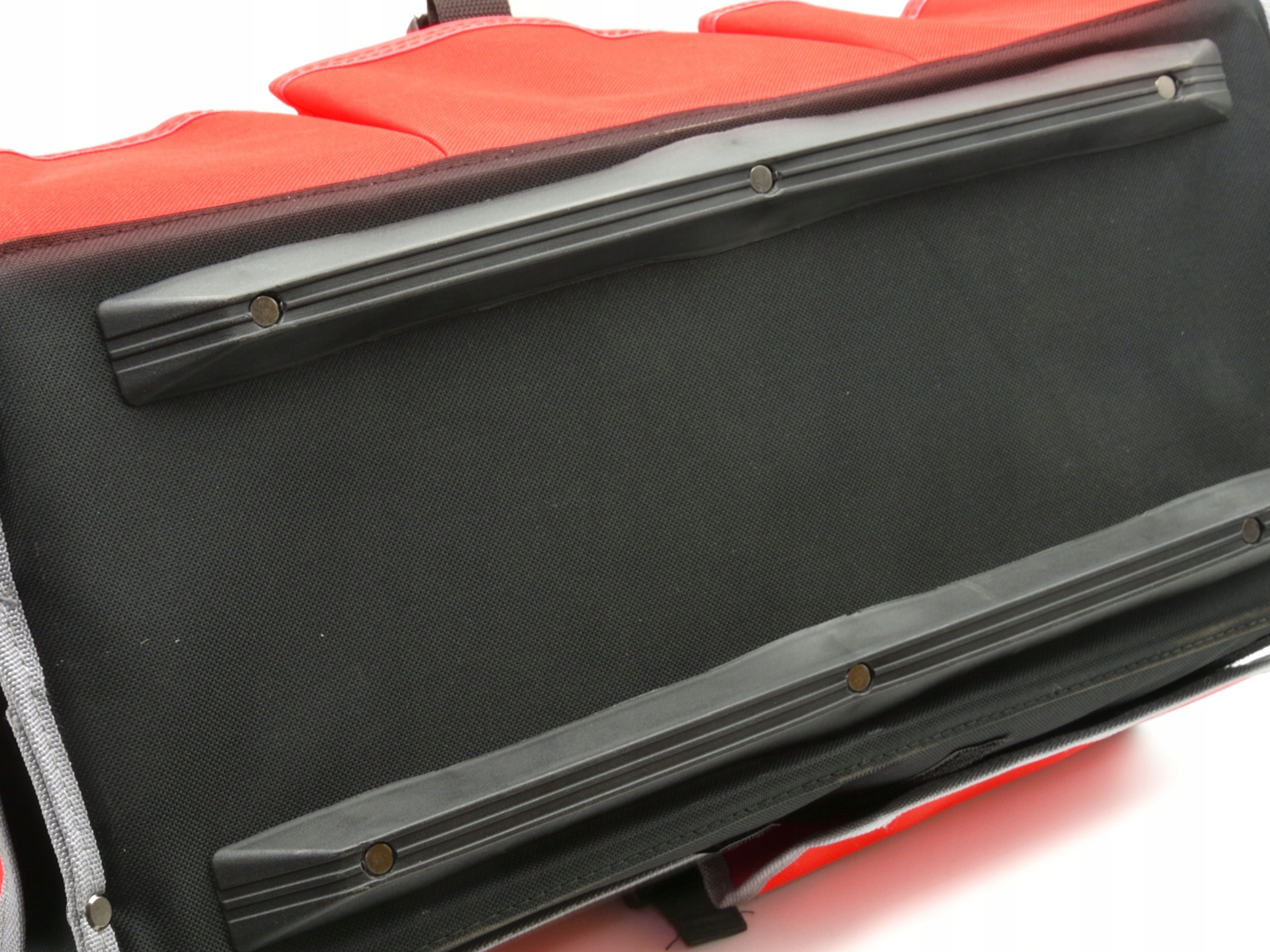 Велика, простора сумка з технічного поліестеру 600 D. Дно сумки, шви та основного замка, виготовленого в армованої версії, адаптованої для перевезення великих навантажень. Центральна ручка з кріпленням на липучках та кріпленням кріплення полегшує транспорт. Оснащений кишенями різного розміру та долею.