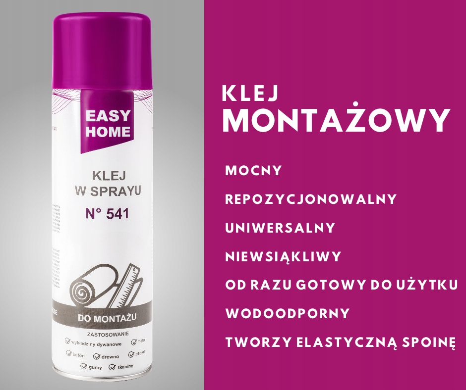 EASY HOME 541 - багатофункціональний монтажний клей у вигляді спрею, який ідеально склеює метал, бетон, цеглу, камінь, пробку, фольгу, кераміку, дерево, гуму, жорсткий пластик, скло, поліетилен, а також тканини, губки та картон. Завдяки тому, що він вдало поєднує в собі дуже широкий спектр матеріалів, його можна використовувати у всіх ремонтних, будівельних та монтажних роботах, а також як клей для пароізоляційної плівки.