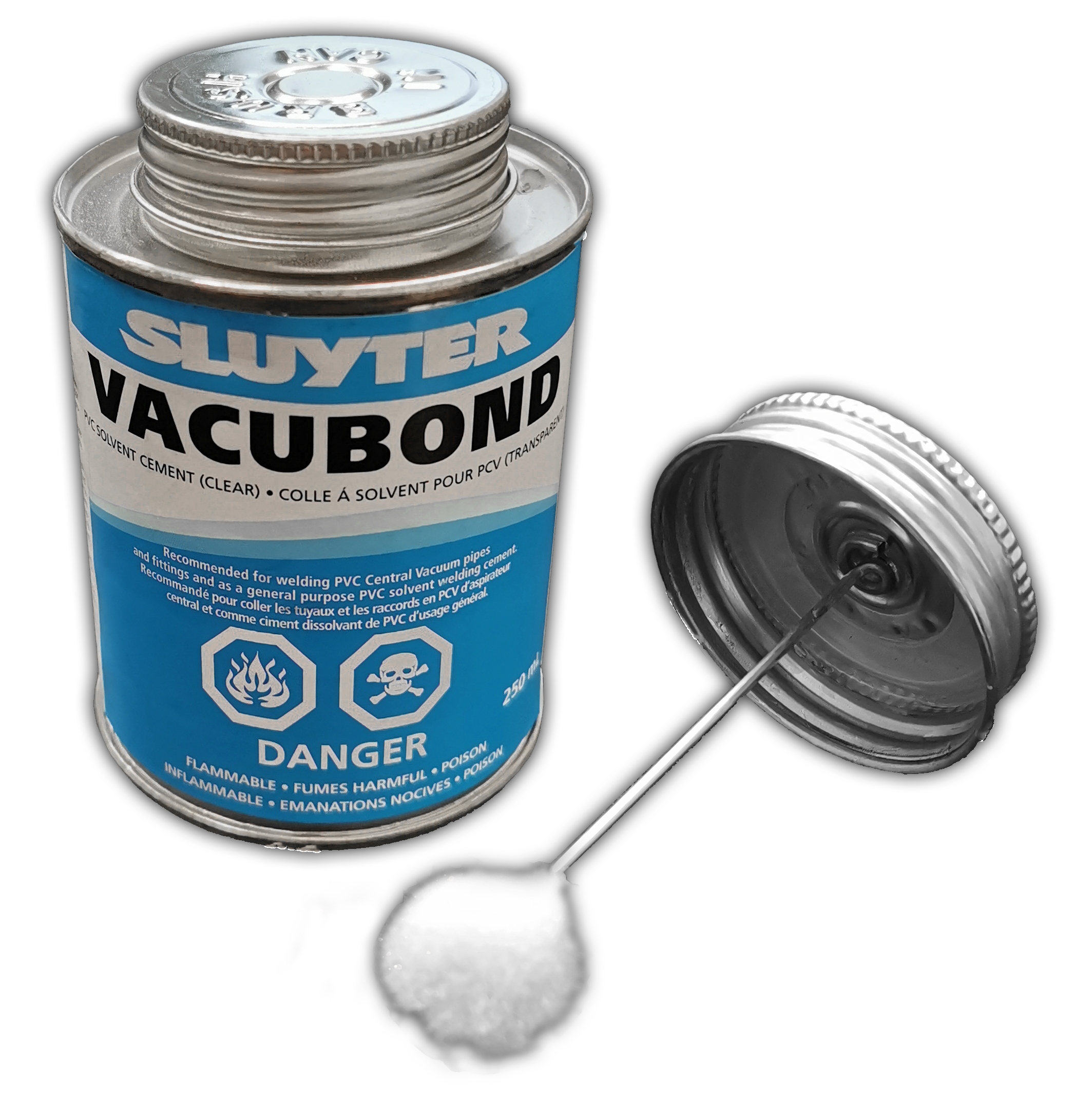 Клей Vacubond® від Sluyter, що входить до комплекту, є єдиною готовою формулою на ринку, призначеною для склеювання елементів центральної вакуумної системи з ПВХ та АБС. Під час процесу склеювання активний інгредієнт глибоко проникає в з’єднувані поверхні, що призводить до структурного з’єднання між з’єднуваними елементами. Отримане таким чином з’єднання гарантує максимальну міцність і 100% герметичність.
