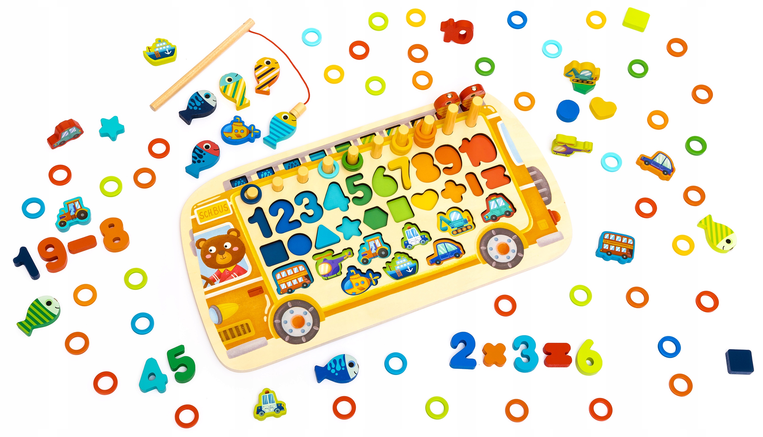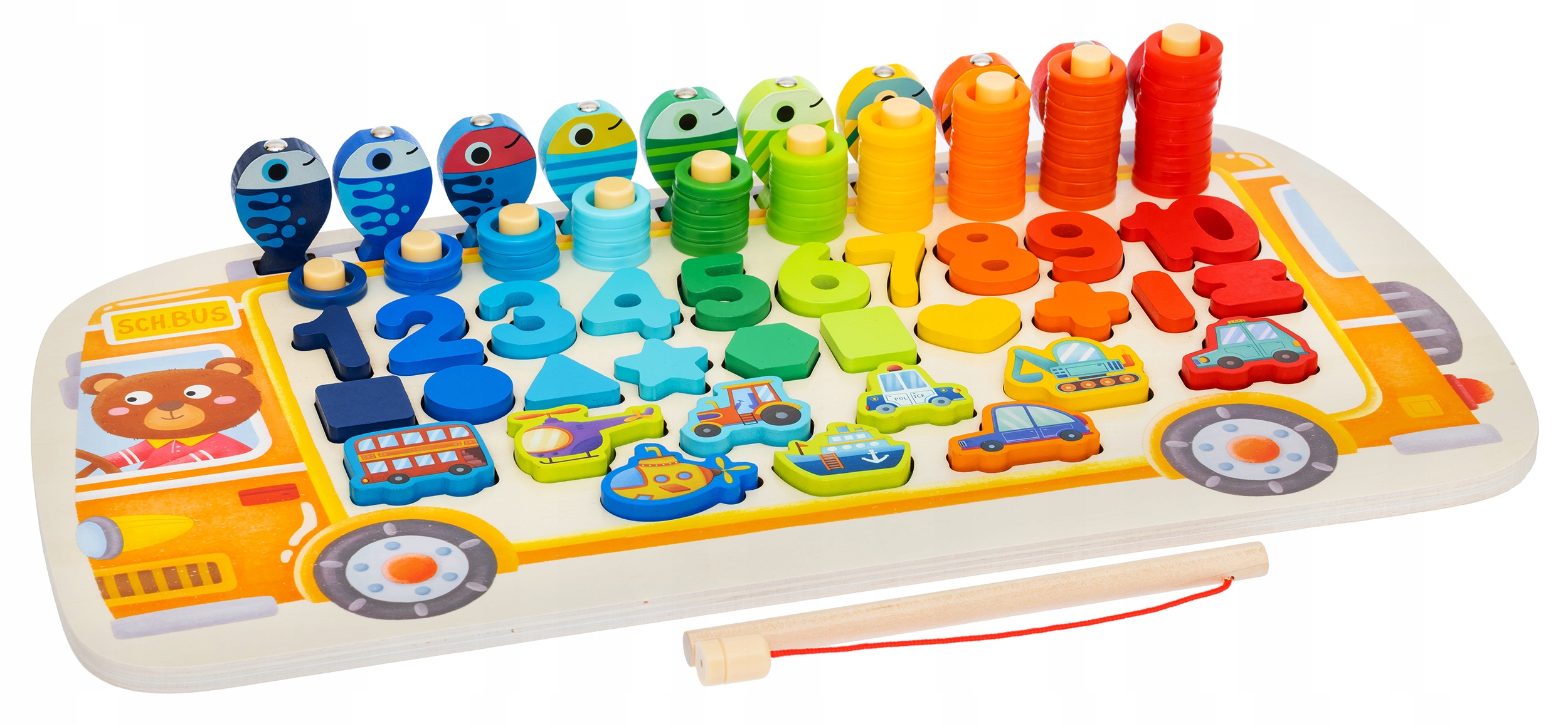 Bus Wooden Numbers Puzzle Fish Game — це іграшка, завдяки якій дитина розвиває моторику та когнітивні навички. Іграшка сприяє розпізнаванню кольорів, форм і цифр.