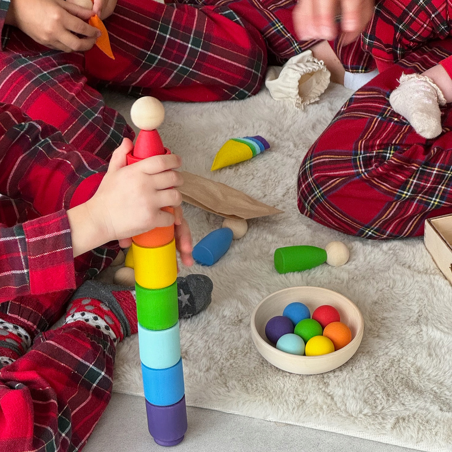 Монтессорі Дерев’яна іграшка Веселка: Ляльки з кілочками в чашках з капелюшками та кульками