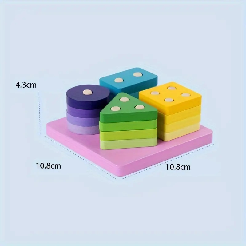 - Ця дерев’яна головоломка для сортування та укладання складається з 17 елементів, включаючи блоки з 4 геометричними формами. Діти можуть розвинути здатність диференціювати форму, колір та розмір від раннього віку, намагаючись відповідати блок або створювати різні комбінації.