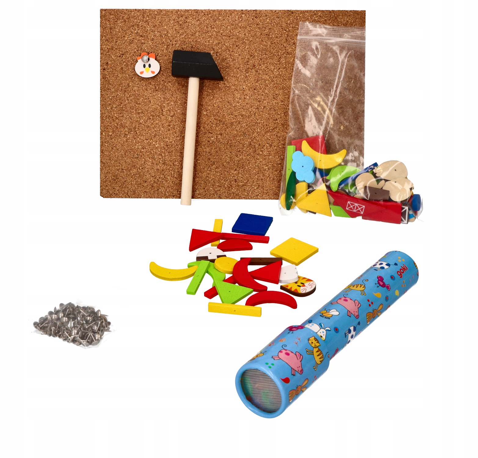 Фігурки та дерев'яні елементи укладання мають додаткові отвори для вставлення шпильки. Гарне кошеня, весела корова чи жовте курча підкорять ваші серця. Що не менш важливо, завдяки цим елементам дитина створить багато цікавих творінь і викличе в уяві різноманітні образи. Усе за допомогою молотка та шпильок.