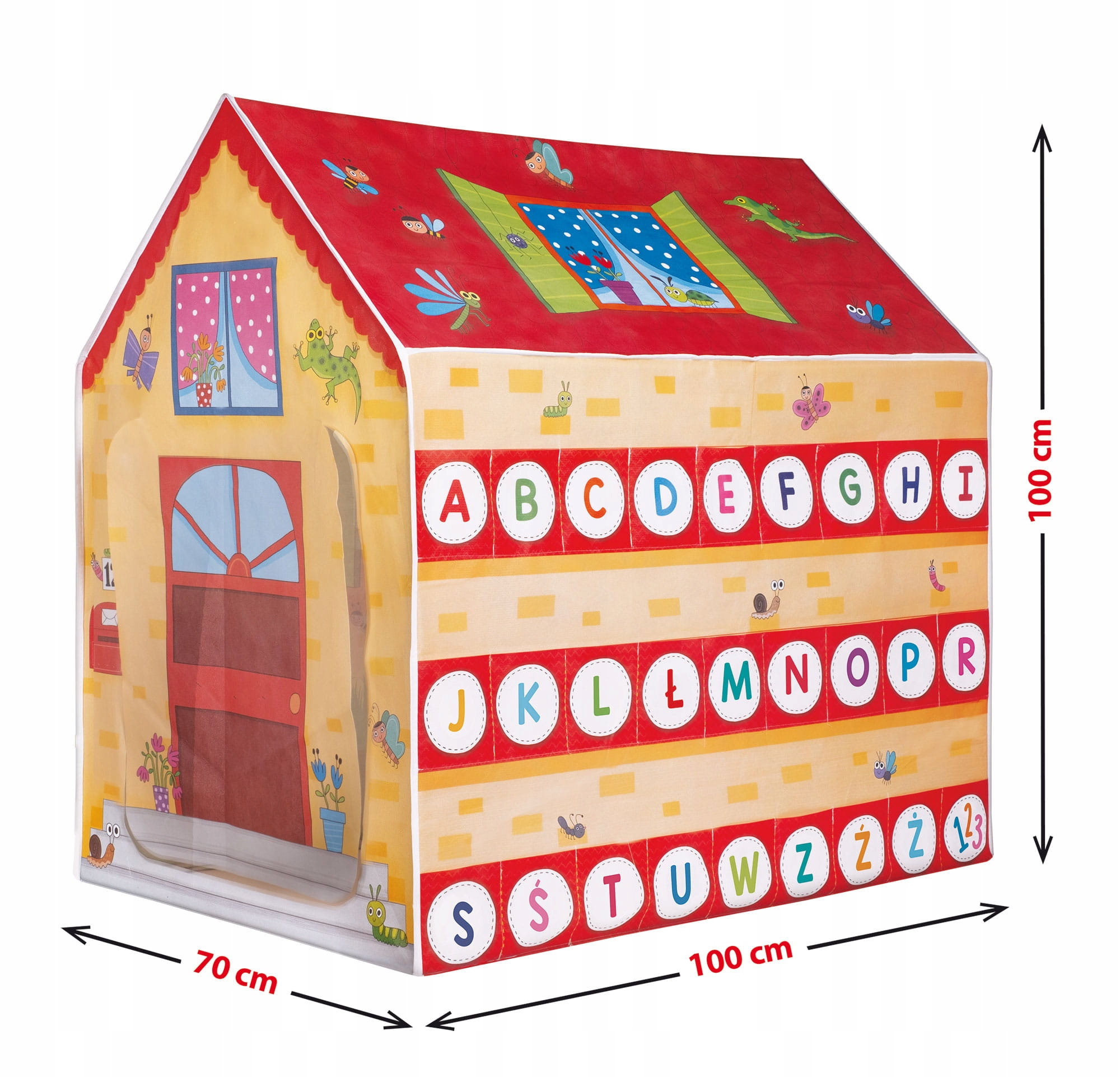 Будиночок обладнаний 2 входами, розвиваючою графікою, кишенями з буквами алфавіту для картки для читання та кишеньки для квітів.