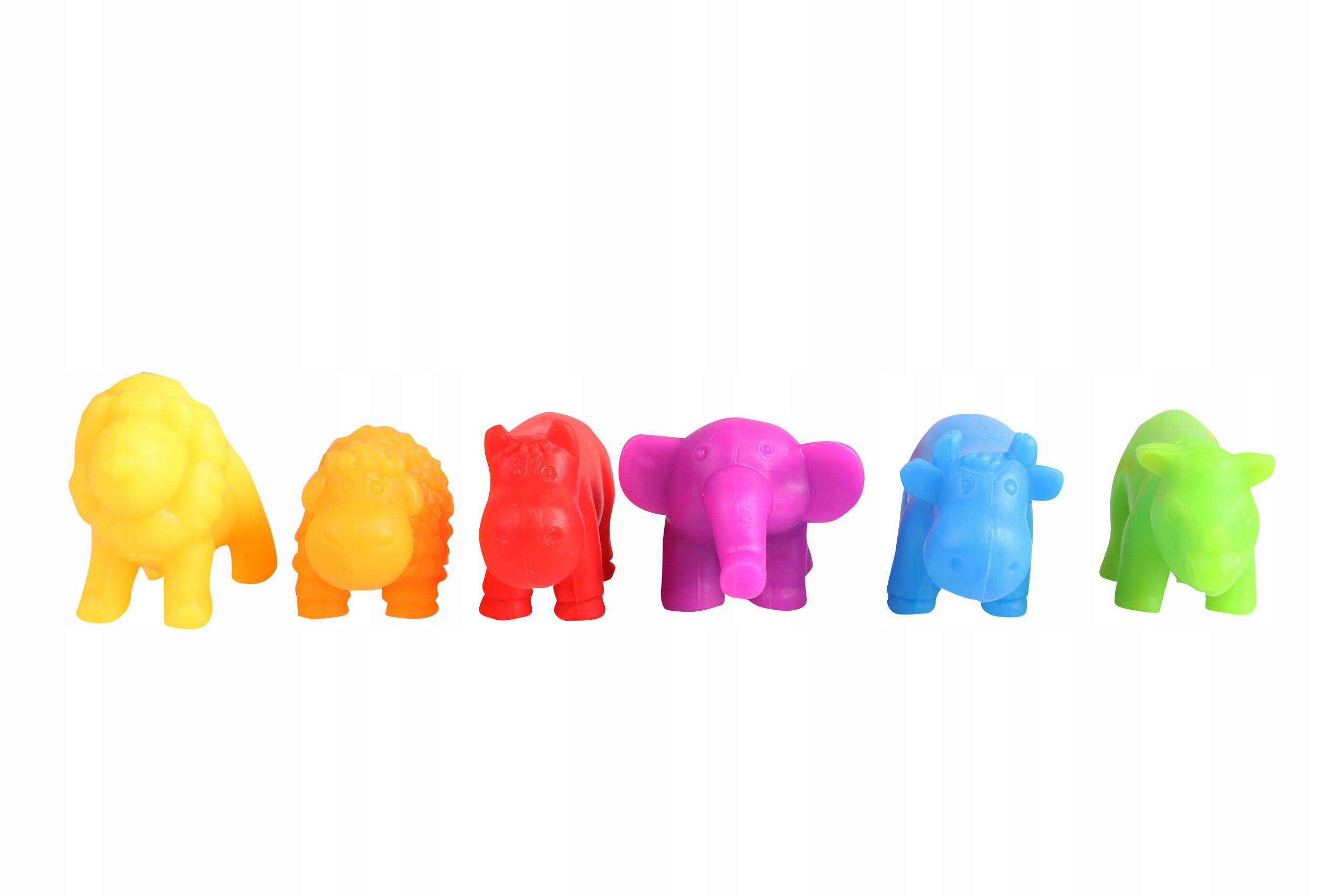 гумові тварини, 5 тварин різних яскравих кольорів кольори жовті леви, помаранчеві вівці, червоні бегемоти, фіолетові слони, сині корови, зелені носороги,