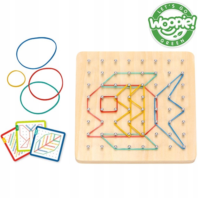 Дерев'яний пазл Geoplan від бренду WOOPIE із серії GREEN є навчальна гра творчість та уява. Набір складається з 48 резинок і 20 двосторонніх карток з 40 візерунками різного ступеня складності (3 рівня). У цій грі діти намагаються відтворити зображення на листівці за допомогою гумок – створюють контури різних форм, наприклад, рибок. Забаву можна урізноманітнити грою в запам'ятовування і відтворення картинки малюком по пам'яті. Дитина також може придумати власну форму/фішку - це обмежено лише креативністю та уявою. Іграшка розвиває ручні навички та логічне мислення, уява та креативність, концентрація та пам'ять.