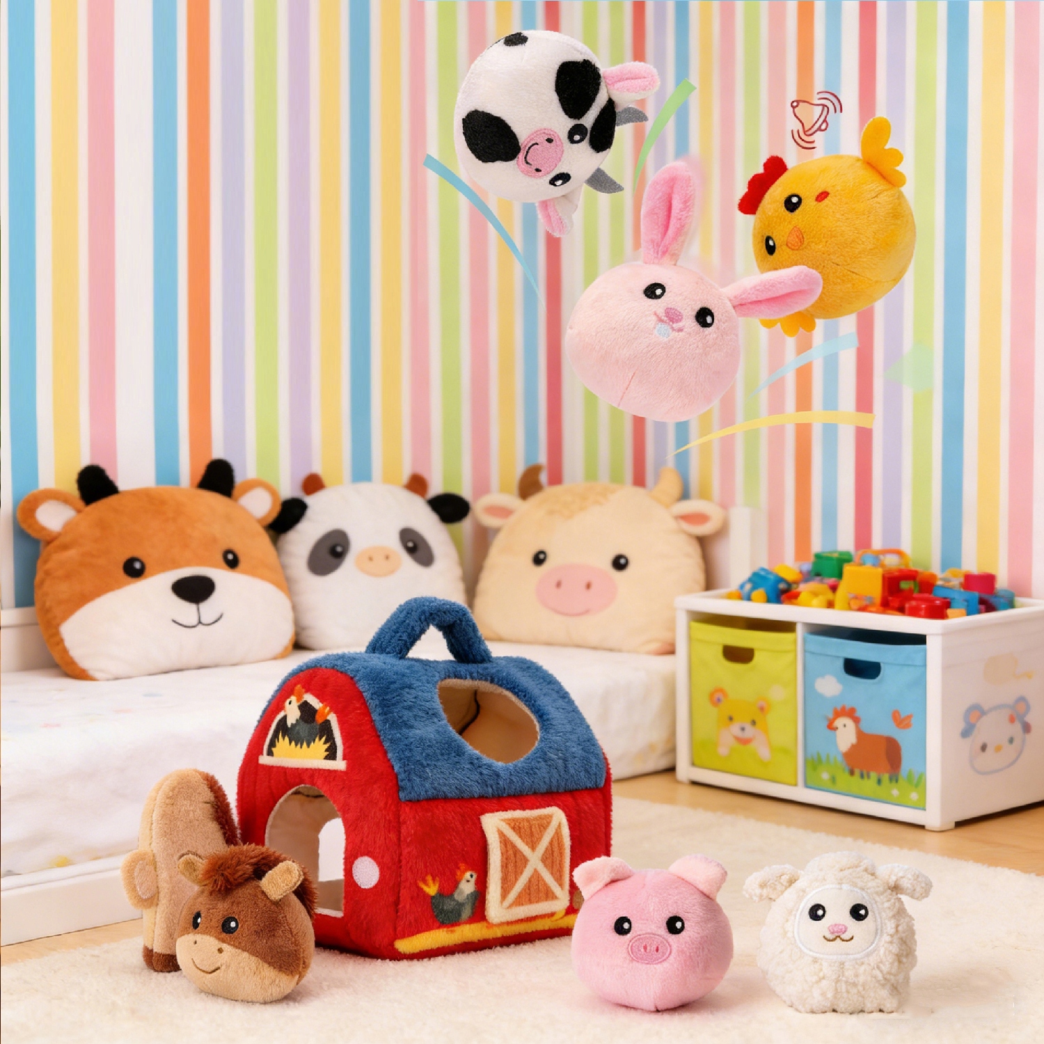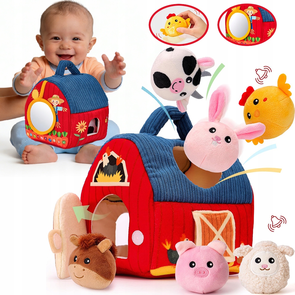 Цей чарівний набір включає **1 чарівний сарай із дзеркалом** і **6 чарівних плюшевих тварин на фермі**, усі виготовлені з високоякісних, м’яких та приємні до шкіри матеріали. Це більше, ніж просто іграшка; це шлях до сенсорного дослідження та інтерактивної гри, ніжний до ніжної шкіри вашої дитини.