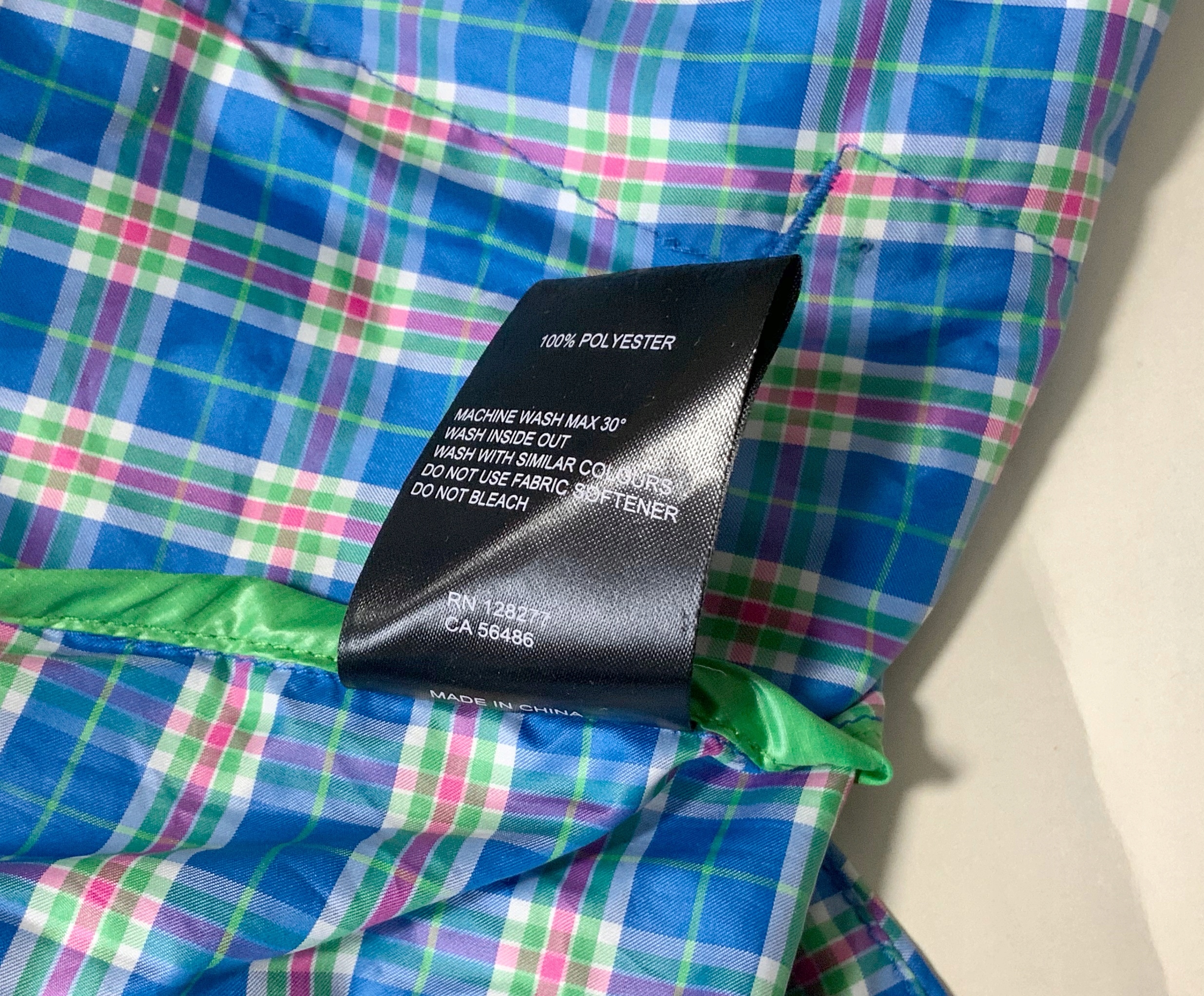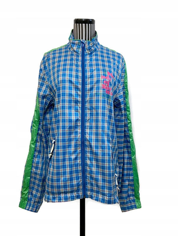 Ультратонка куртка з напівматового нейлону з синьо-зелено-рожевим візерунком у клітку. Дуже легкий і тонкий. Дихаючий. Вентиляційні отвори під пахвами і на шиї. Довжина до середини стегна. Спинка довша. Відтягування стопором. Застібається на блискавку YKK високо до шиї. Комір-стійка на шию. Спереду дві кишені на блискавці. Рукава зібрані гумкою в тунель. Світловідбиваючий логотип, надрукований спереду та ззаду. Без слідів використання.
