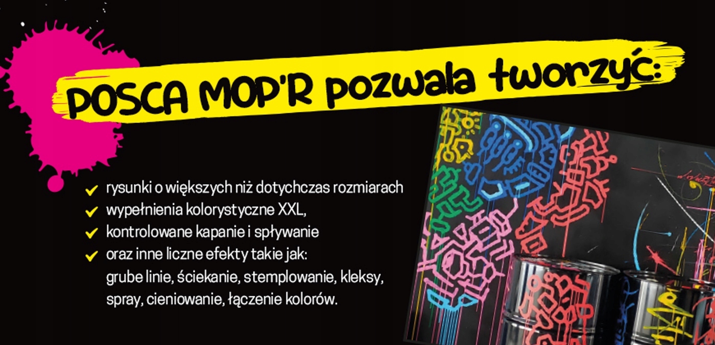 Завдяки ергономічній формі та цікавому дизайну POSCA MOP'R забезпечують комфортну і стабільне захоплення b>і абсолютно нові художні враження. Ви можете використовувати їх для створення великих малюнків горизонтально або вертикально.