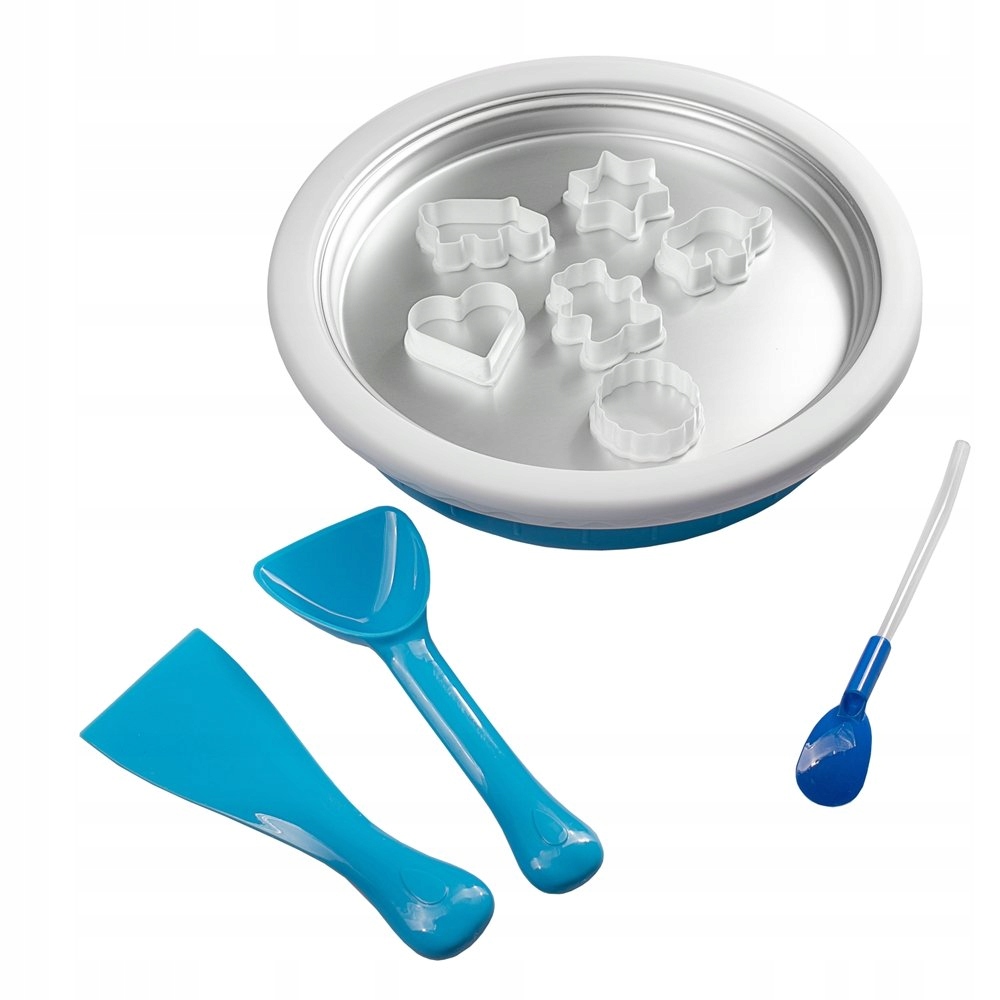 Як здивувати гостей і домочадців смачним морозивом і домашніми десертами з морозива? З нашим набором тайського морозива (працює без електрики :)) це справді дитяча гра! Мода на загорнуте морозиво прийшла до нас з Індонезії, де таке морозиво дуже популярно на вулицях, а зараз воно підкорює практично всі країни світу. Як зробити власне морозиво? Спочатку наповнену спеціальним гелем миску ми ставимо догори дном у морозильну камеру мінімум на 24 години (оптимально при температурі -23 градуси Цельсія), а потім на охолоджену миску виливаємо попередньо приготовлену суміш для морозива, яка починається заморозити на тарілці. Рецептів такого морозива ви знайдете в Інтернеті безліч, а також можете створити його самостійно, використовуючи все, що підкаже ваша фантазія. Вилийте суміш для морозива в центр миски, а коли вона стане занадто густою для самостійного нанесення, рівномірно розподіліть її по поверхні за допомогою шпателя. Суміш починає швидко застигати на поверхні охолодженої тарілки, після чого її можна починати «скрібати» шпателем і ложкою енергійними рухами. Морозиво розгортається під лопатками у смачні крижані булочки, з яких можна створювати різні десерти з фруктами, посипаннями, соусами, сухофруктами, іншими солодощами, збитими вершками, шоколадом тощо. Все залежить від вашої творчості, і ви можете ложкою його в чашки, на тарілки, у склянки з шейком. Крім лопатки, в набір входить ложка, 6 веселих формочок для вирізання форм для льоду і ложка для сорбету або шейків.