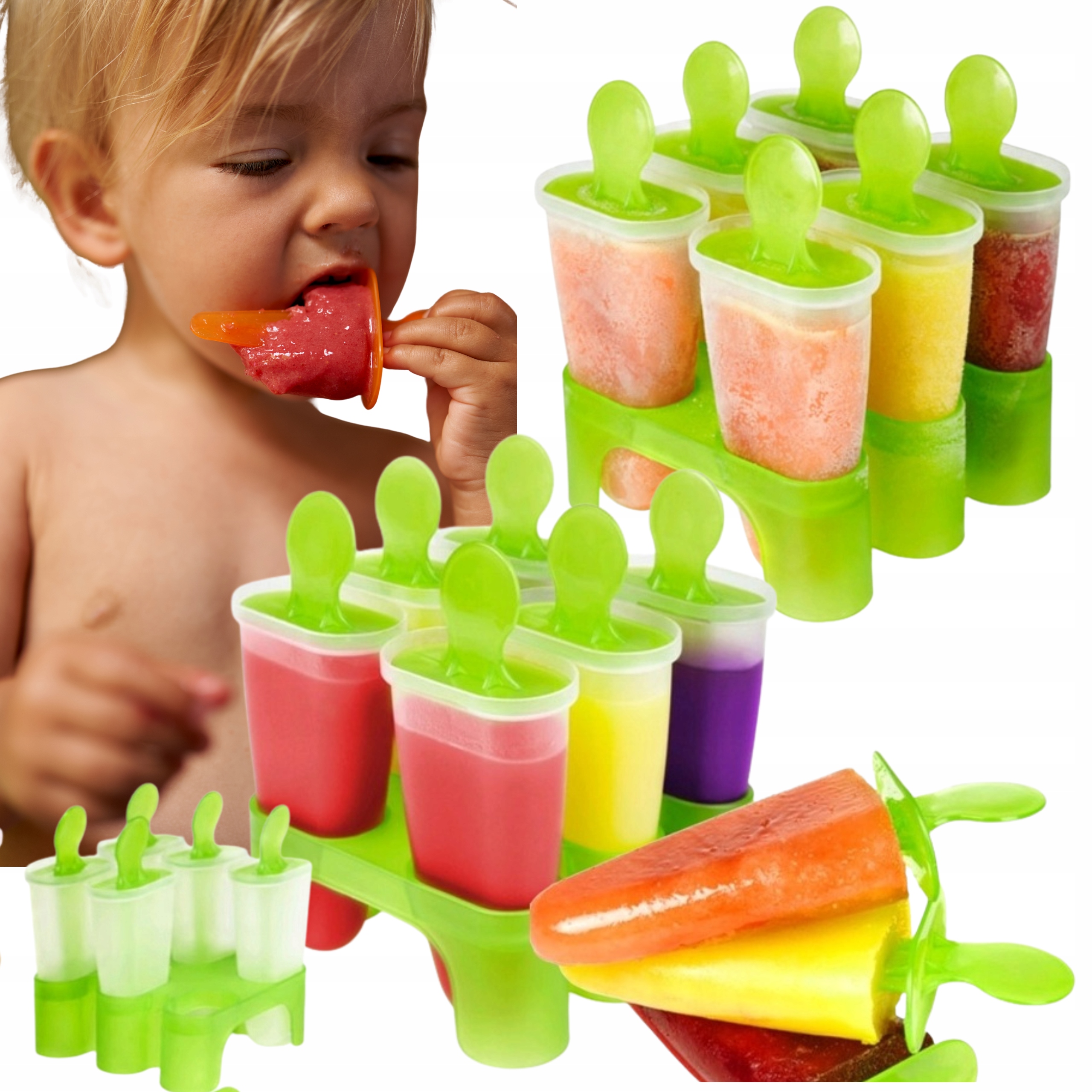 Форми мають підставку для легкої підготовки морозива . Все, що вам потрібно зробити, - це нанести морозиво, підготовлене раніше на форми, покласти його в морозильну камеру та делікатність льоду! Полоски виготовлені з пластику, вони багаторазові, прості у використанні та зберігають чисті.