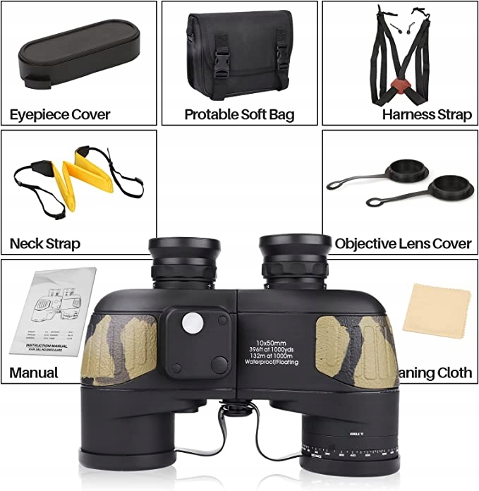 Морський бінокль 10x50, далекомір з підсвічуванням, компас, водонепроникний IPX7