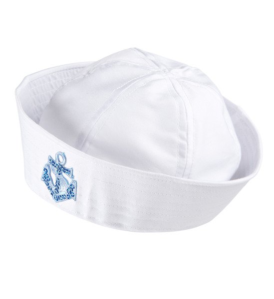Кепка з білого матеріалу. На передній частині капелюха - вишитий темно-синій якір з паєтками.