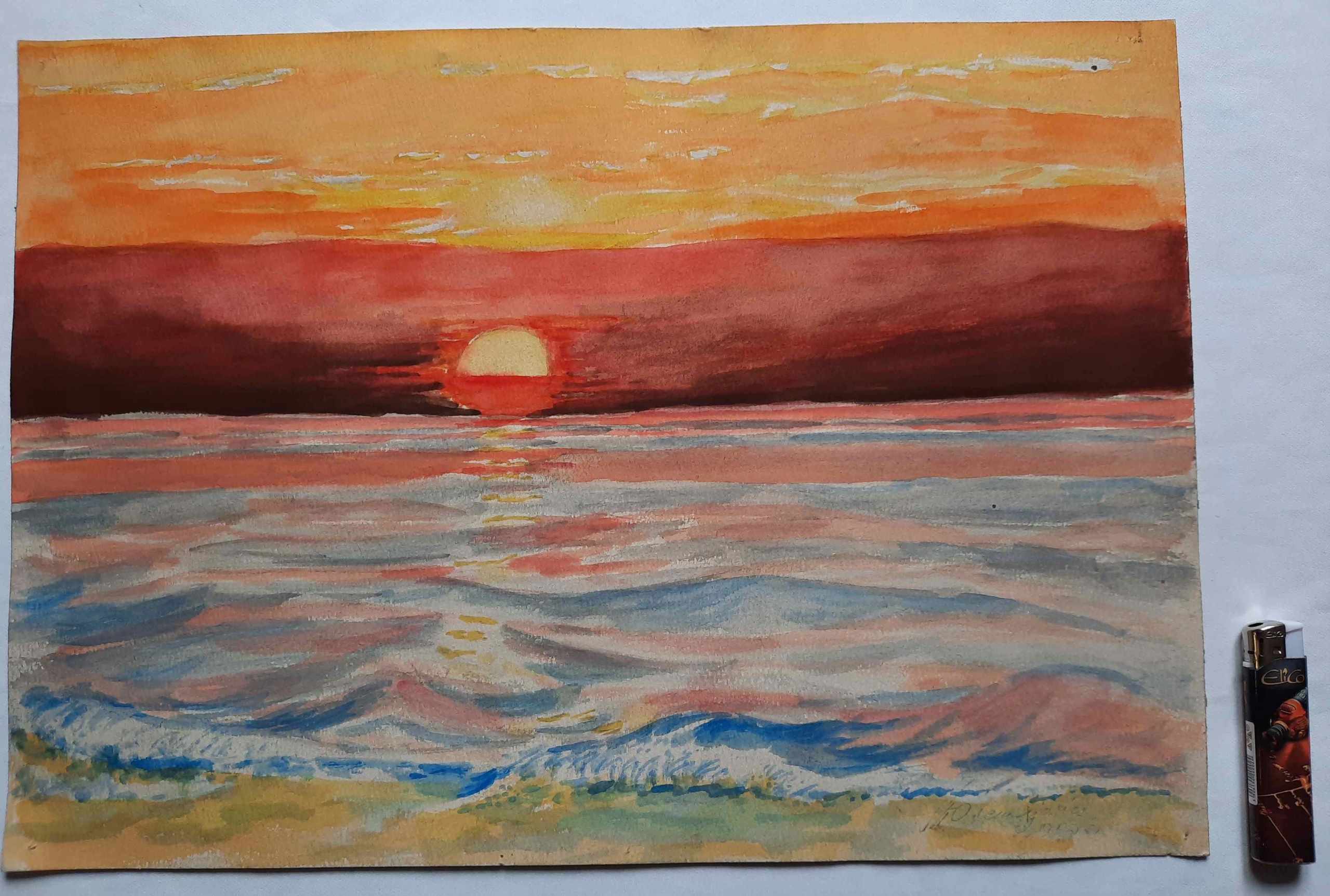 МОРСЬКИЙ ПЕЙЗАЖ ЗАХІД МОРСЬКА АКВАРЕЛЬ ПІДПИС