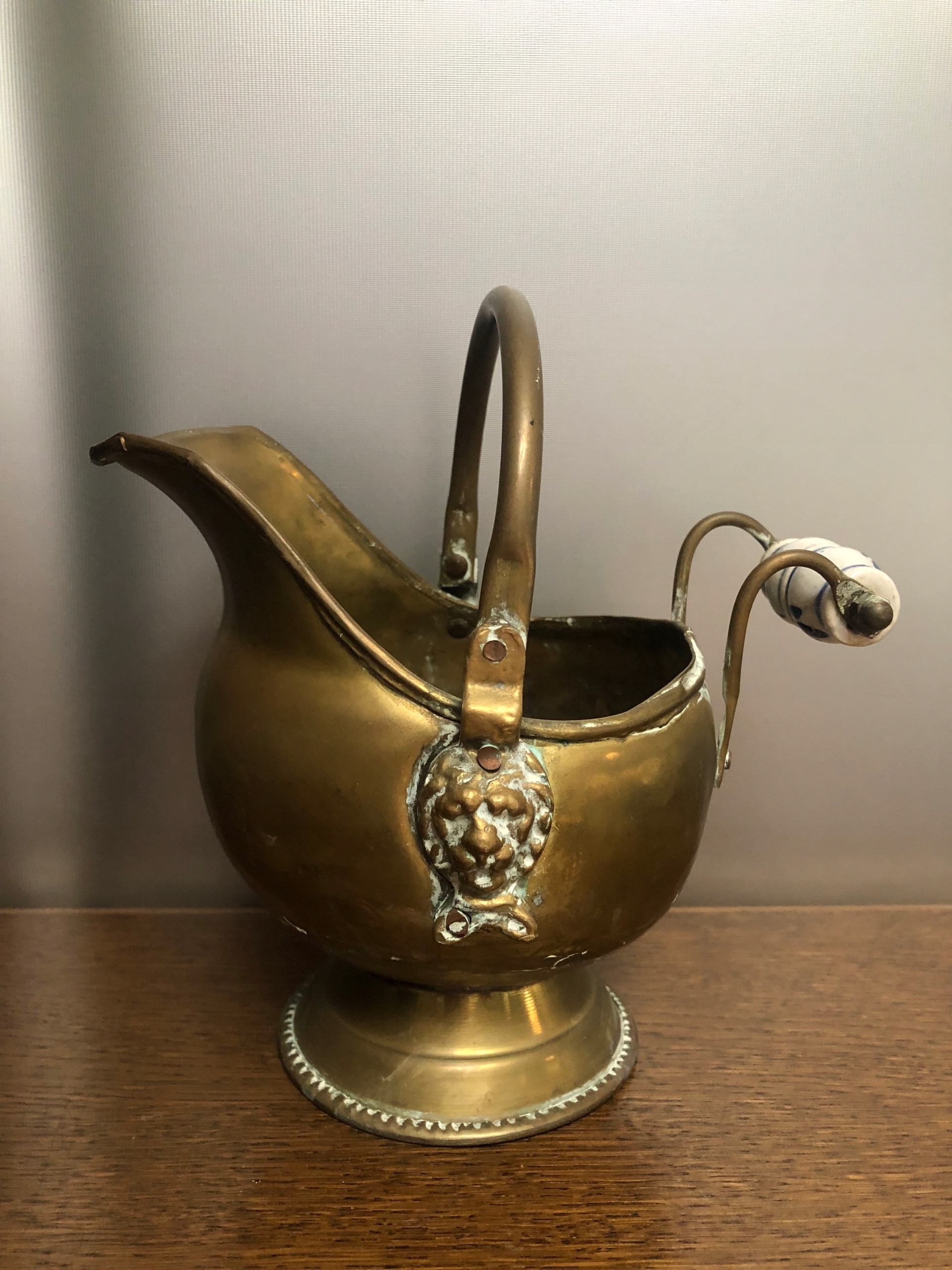 Mosiężna osłonka doniczka węglarka z lwami i ceramicznym uchwytem