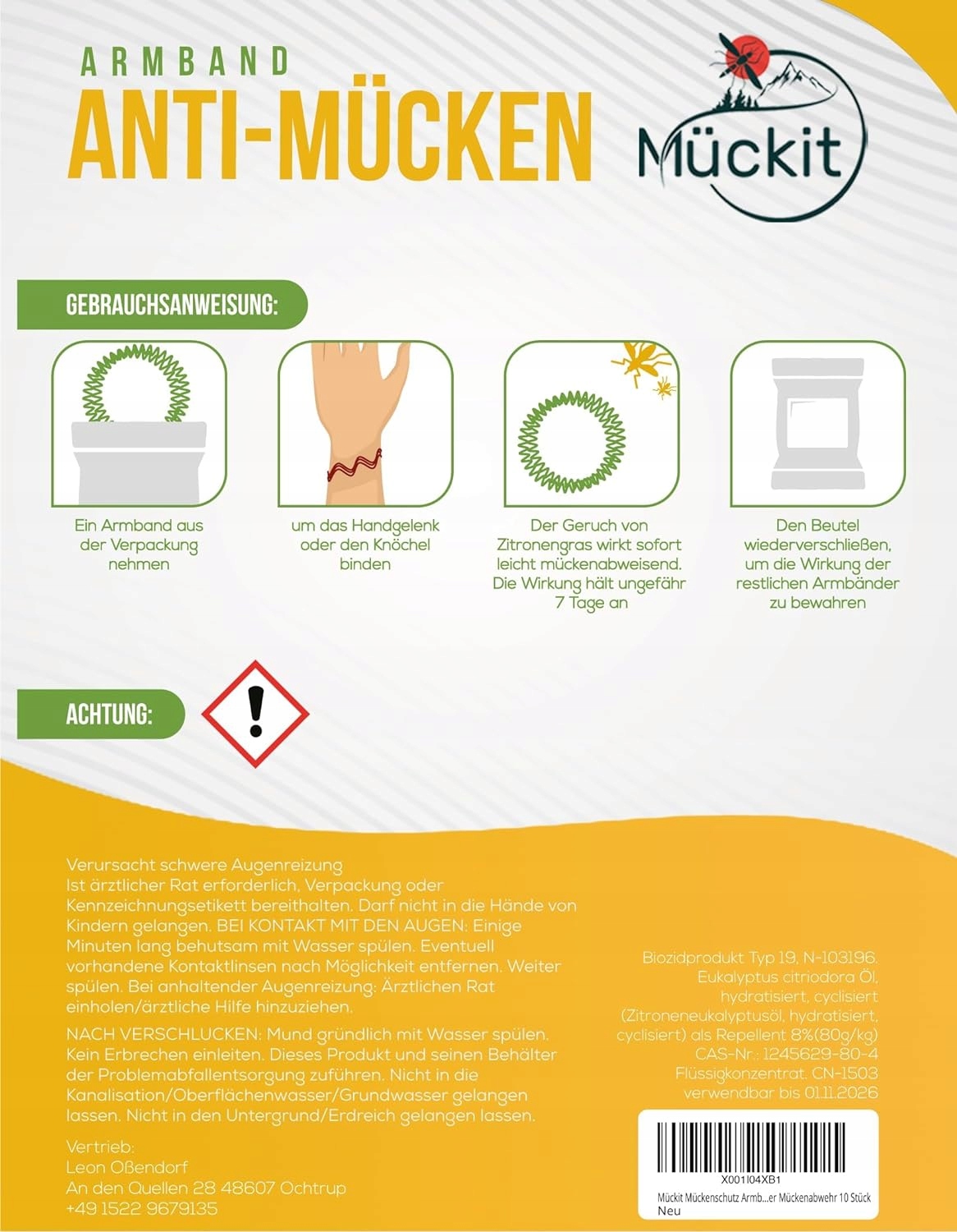 Біоцидні препарати слід застосовувати з обережністю. Перед використанням завжди читайте етикетку та інформацію про продукт. Зареєстрований біоцидний препарат N-103196 (реєстраційний номер BAUA). Протимоскітні браслети забезпечують захист від комарів, кліщів, мошок, глистів та інших комах до 15 днів. В якості діючої речовини ми використовуємо ефірну олію евкаліпта цитріодора. Коли браслети не використовуються, їх слід повернути в сумку та закрити, щоб зберегти функціональність. Протимоскітні браслети засновані на суто рослинних діючих речовинах. Тому 100% захисту від комарів не можна гарантувати. Не можна виключити індивідуальні укуси комарів.