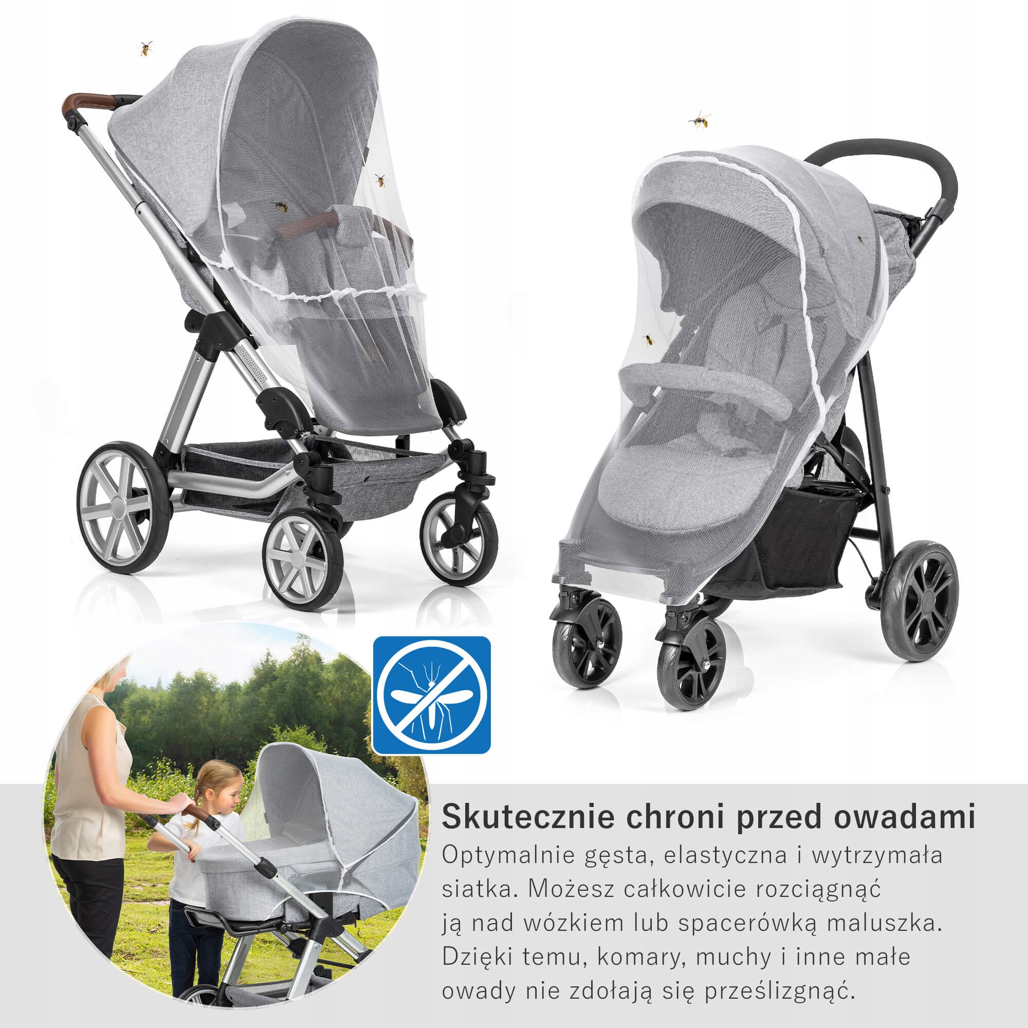 - Москітна сітка достатньо велика, щоб покриває всю коляску - завдяки цьому навіть комахи не пролізуть боком