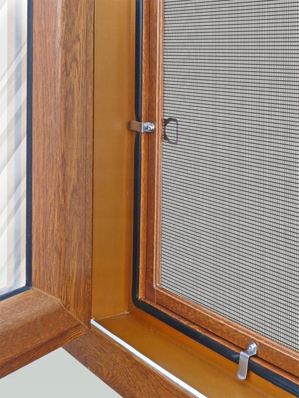 Рамкова москітна сітка кріпиться на віконну раму за допомогою металевих пластин, які перекривають ущільнювач вікна, що дозволяє швидко демонтувати взимку або для чищення.