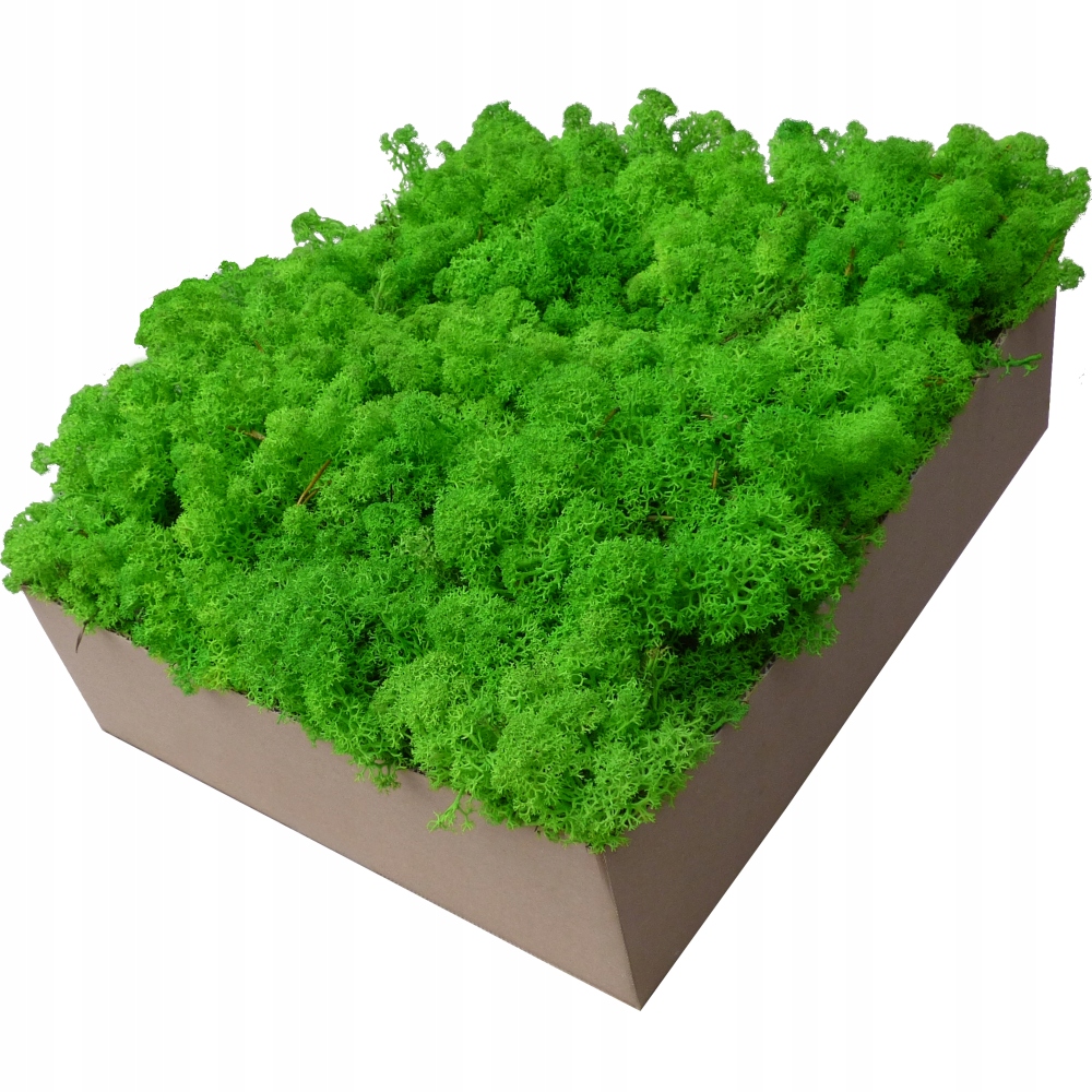 Chrobotek grass green moss зі світлим зелений колір. Товар упакований в картонну коробку 600г в один шар, естетично оформлений. Мох витягнутий з ящика і готовий до роботи. Вихід однієї коробки моху хроботка 600г від 0,07 до 0,09 м2 площі поверхні (до 28х28 см).