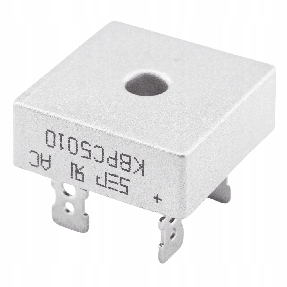 Мостовий випрямляч KBPC5010 з максимальною робочою напругою 1000 В і максимальною силою струму до 50 А. Він оснащений 4 контактами у вигляді конекторів.