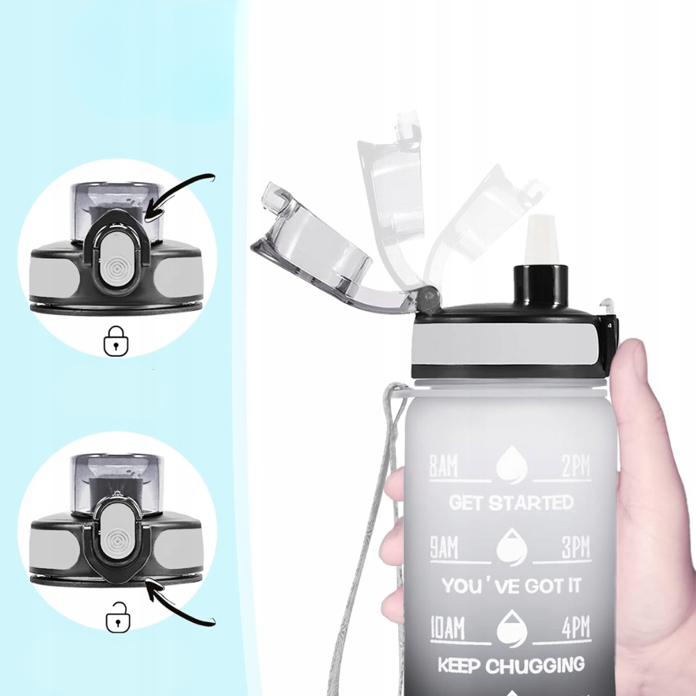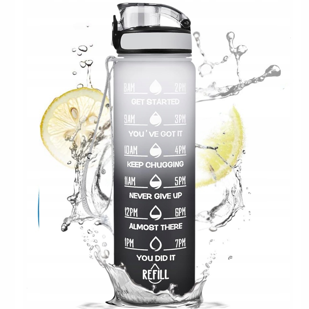 Мотиваційна Спортивна пляшка для заправки з ємністю 1 літр в елегантному білому чорному кольорі - ідеальний вибір для людей, які дбають про регулярну гідратацію. Пляшка, оснащена маркером часу , дозволяє відслідковувати кількість води, що виприла цілий день, мотивуючи вам пити потрібну кількість рідин. Його компактний та функціональний дизайн робить його ідеальним для повсякденного використання, на роботі, у тренажерному залі або під час тренувань.