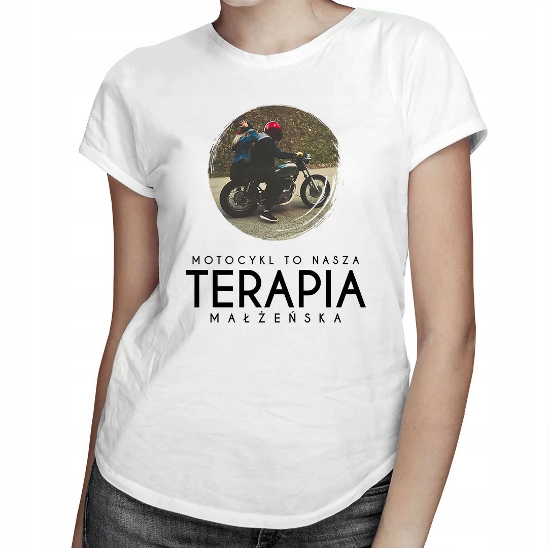 Мотоцикл - наша шлюбна терапія - чоловіча футболка з принтом Футболка - чоловіча біла M ЧОЛОВІЧА ФУТБОЛКА З ПРИНТОМ