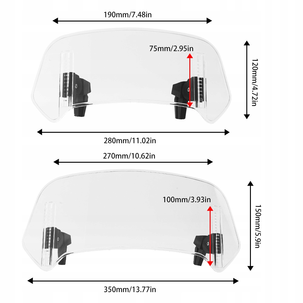5. Розмір лобового скла: доступні 2 розміри, велике: 350x150 мм/13,8x5,9 дюйма, мале: 280x120 мм/11,0x4,7 дюйма, що забезпечує достатнє покриття для посиленого захисту від вітру.