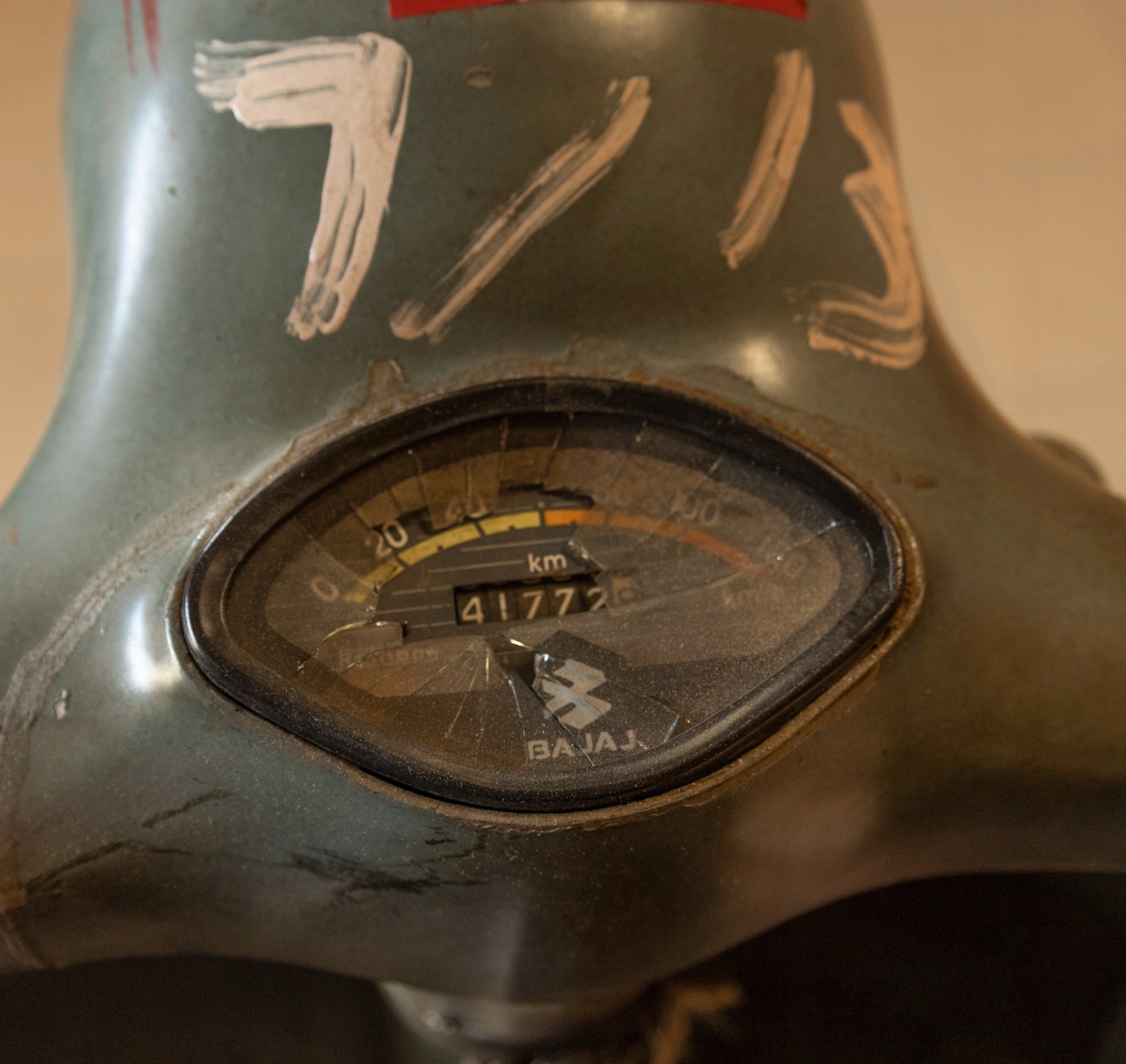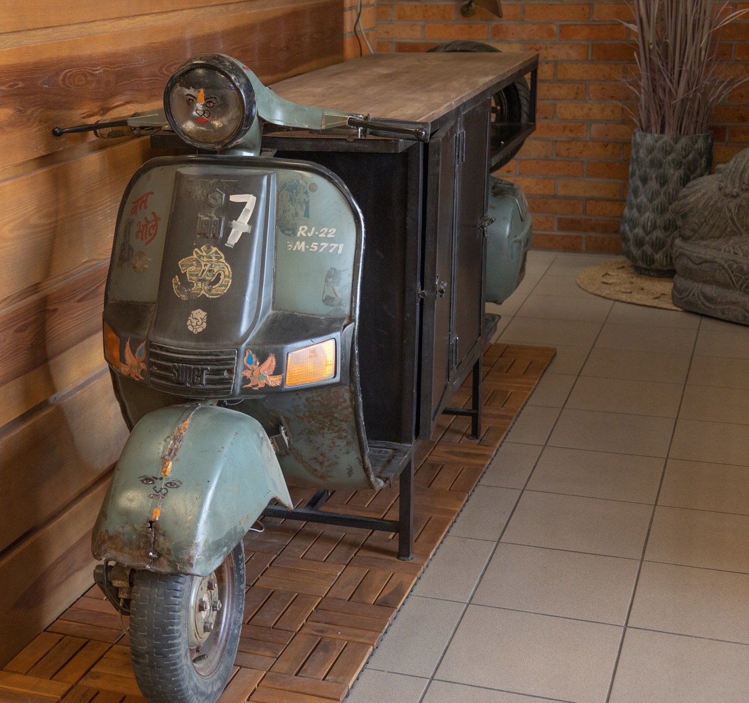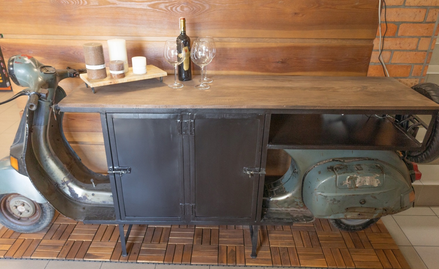 Комод, що імітує мотоцикл, навмисно зістарений шляхом здирання фарби та розбивання спідометра.
