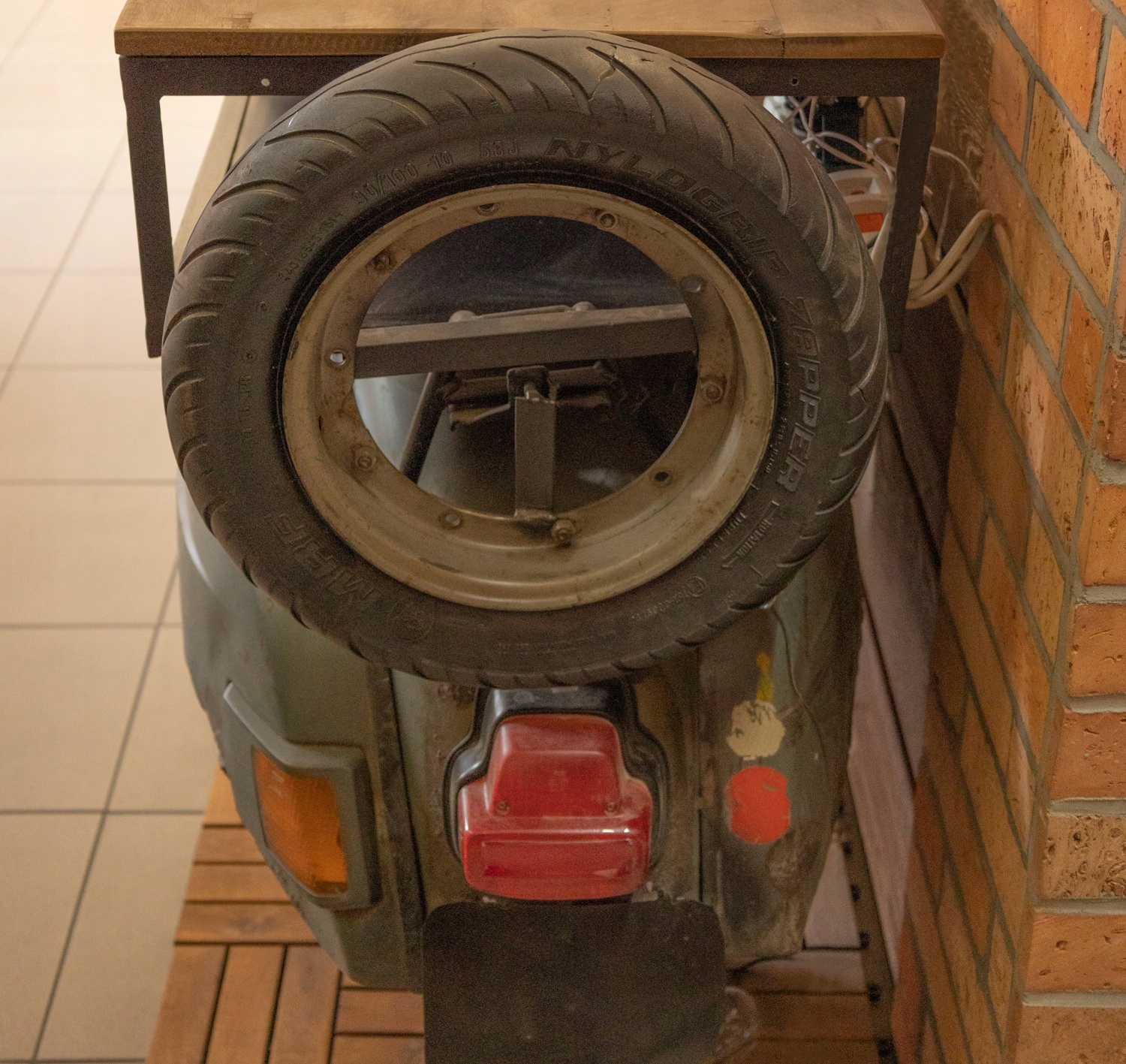 Відтінки сірого з дерев'яним верхом. Може стояти як з правого, так і з лівого боку - має дверцята, що відкриваються з двох сторін. У задній частині мотоцикла є полиця для дрібниць. Масивна дерев'яна верхня частина. Розміри стільниці: 168 x 48,5 см