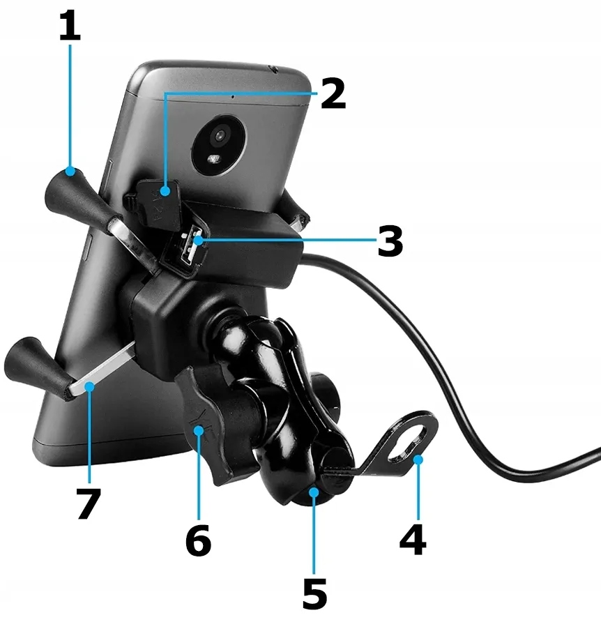 Тримач кріпиться до керма або рами шляхом з’єднання з акумулятором за допомогою кабелів із вушками. Він має подвійну кулькову структуру, яка дозволяє обертатися на 360 градусів (3D), дозволяючи точно й точно регулювати видимість. Підходить для будь-якого телефону та навігаційного пристрою з максимальною шириною 85 мм; ми можемо встановити його на мотоцикл, скутер, квадроцикл тощо. Конструкція тримача виготовлена з алюмінію, що гарантує багаторічну експлуатацію.