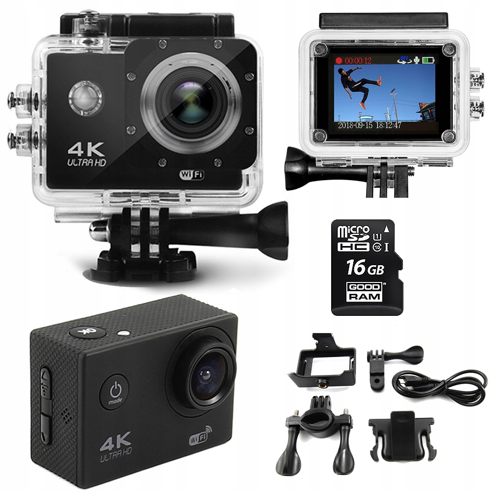 Спортивна камера записує зображення в якості 4k ultra HD. У комплект входять кріплення і підставки, що дозволяють вести запис в будь-яких умовах, навіть під поверхнею води. Водонепроникність до 30 м. Міцний акумулятор і зовнішня пам'ять дозволять записати багато незабутніх моментів. Він важить лише 54 грами разом з акумулятором!