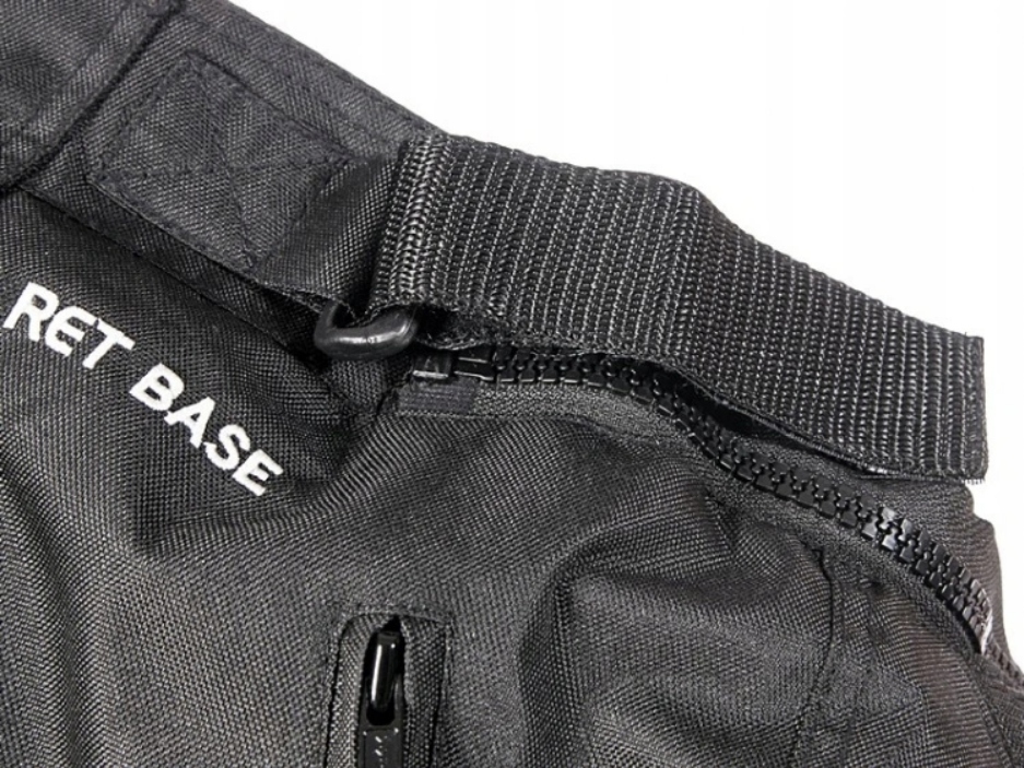 Мотоциклетні штани RETBIKE BASE оснащенічотирма сертифікованими протекторами, розміщеними на колінах і стегнах для забезпечення належної безпеки. Вони регулюються застібками-липучками на талії, а на ніжках вшита блискавка вздовж литок.