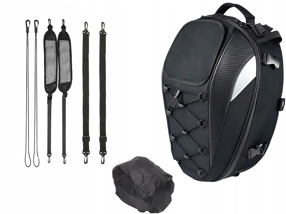 Універсальна сумка підходить для більшості мотоциклів, застібається на регульовані пряжки. Його також можна використовувати як рюкзак для носіння на спині.