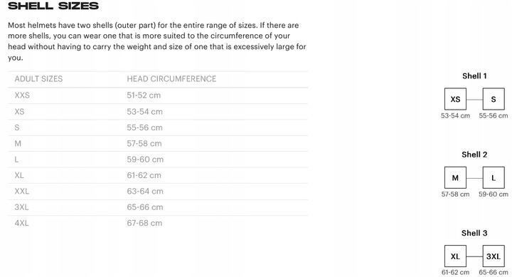 - 3 розміри корпусу: XS-S / M-L / XL-3XL (зовнішній розмір шолома змінюється)