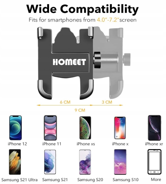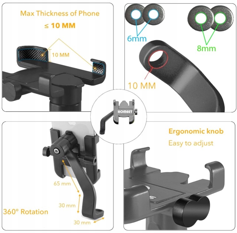 Матеріал: алюмінієвий сплав + нержавіюча сталь. Діаметр керма: ≤ 33 мм. Homeet Мобільний тримач - Ширина мобільного телефону: 60-105 мм. Товщина мобільного телефону: ≤ 10 мм. Колір: сірий. Розмір упаковки: 120 мм x 95 мм x 90 м.