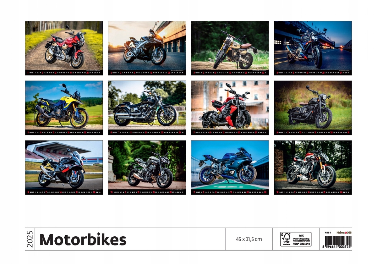 Календар Motorbikes 2025, опублікований Helma 365, — це колекція ретельно відібраних і чудово опублікованих фотографій. Мотоцикли виглядають приголомшливо у великому форматі та горизонтальній календарній розкладці. Вони підкорять серце кожного любителя двоколісних автомобілів. Після закінчення 2025 року календарні дошки можна успішно використовувати як плакати.