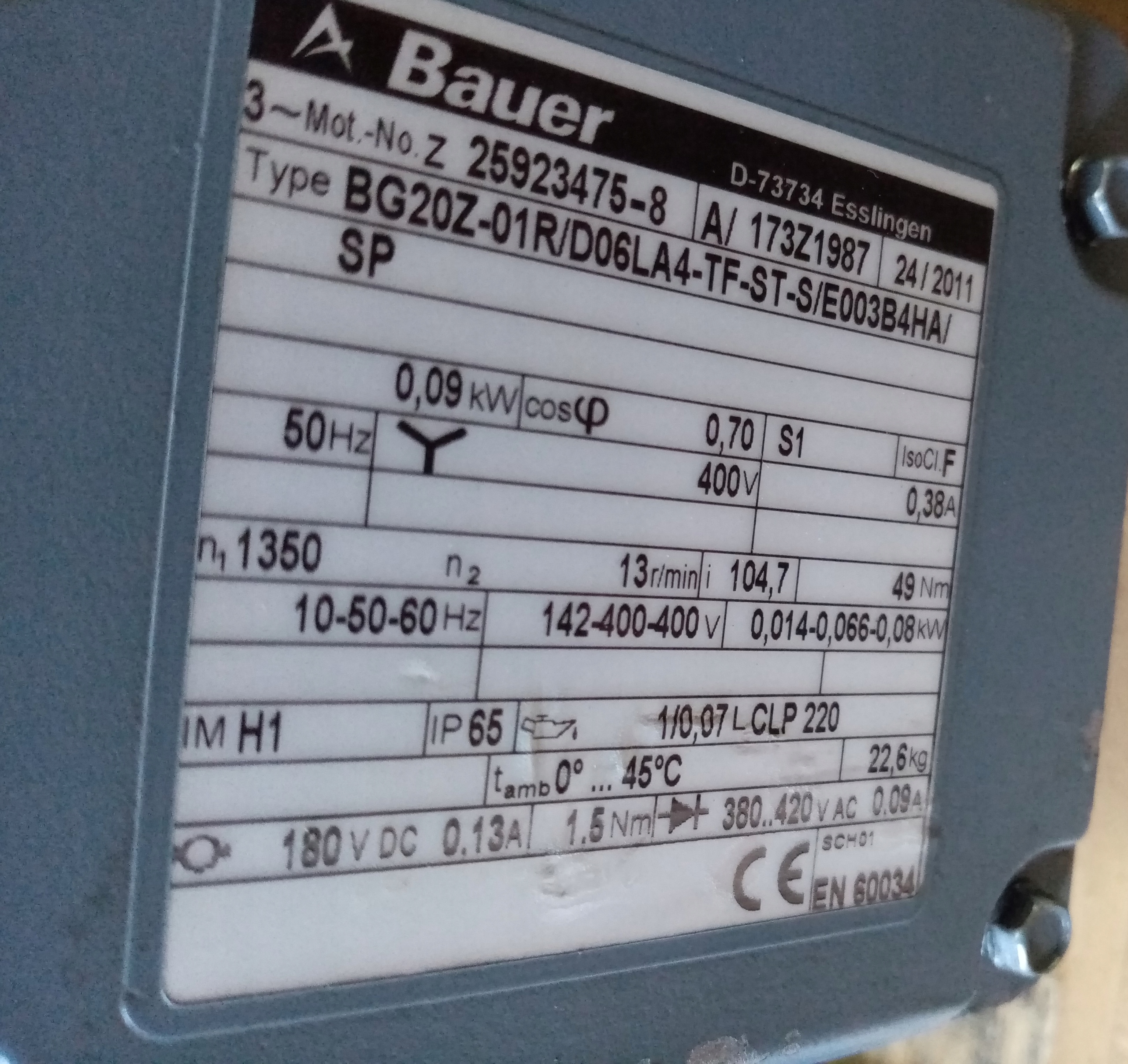 Мотор-редуктор Bauer 0,09 кВт 13 об./хв. Гальма