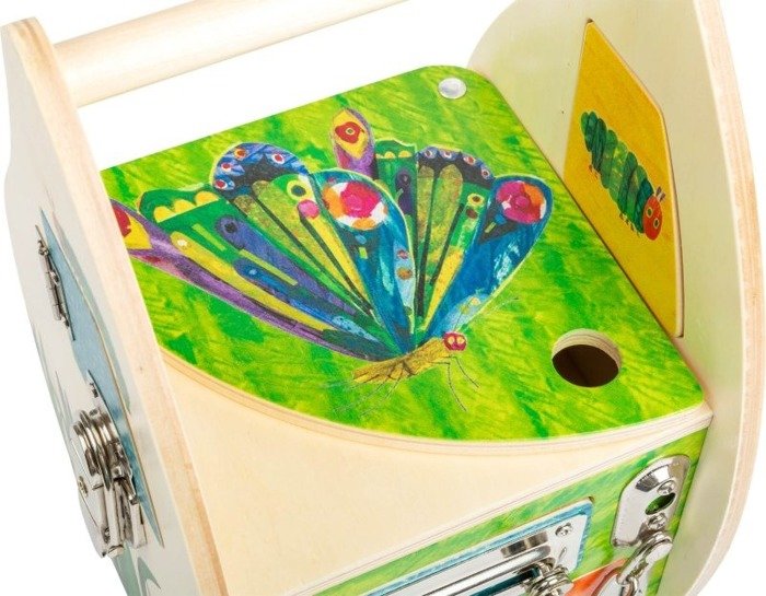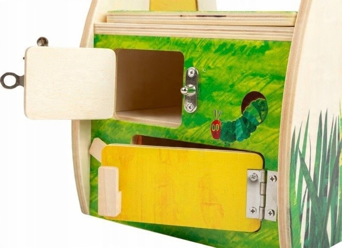 Дерев'яний будиночок із замками The Very Hungry Caterpillar Small Foot Design — це гарний набір, створений з урахуванням дітей та їхніх потреб. Відкривати та закривати захищені відсіки та виявляти ті, що мають фальшиві дна, — чудова й активна розвага. Окремі засувки, ланцюжки, навісні замки та важелі мають великий вплив на дрібну моторику та здібності найменших. Окремі елементи виготовлені з дерева та металу, щоб вони могли служити своїм власникам багато років.