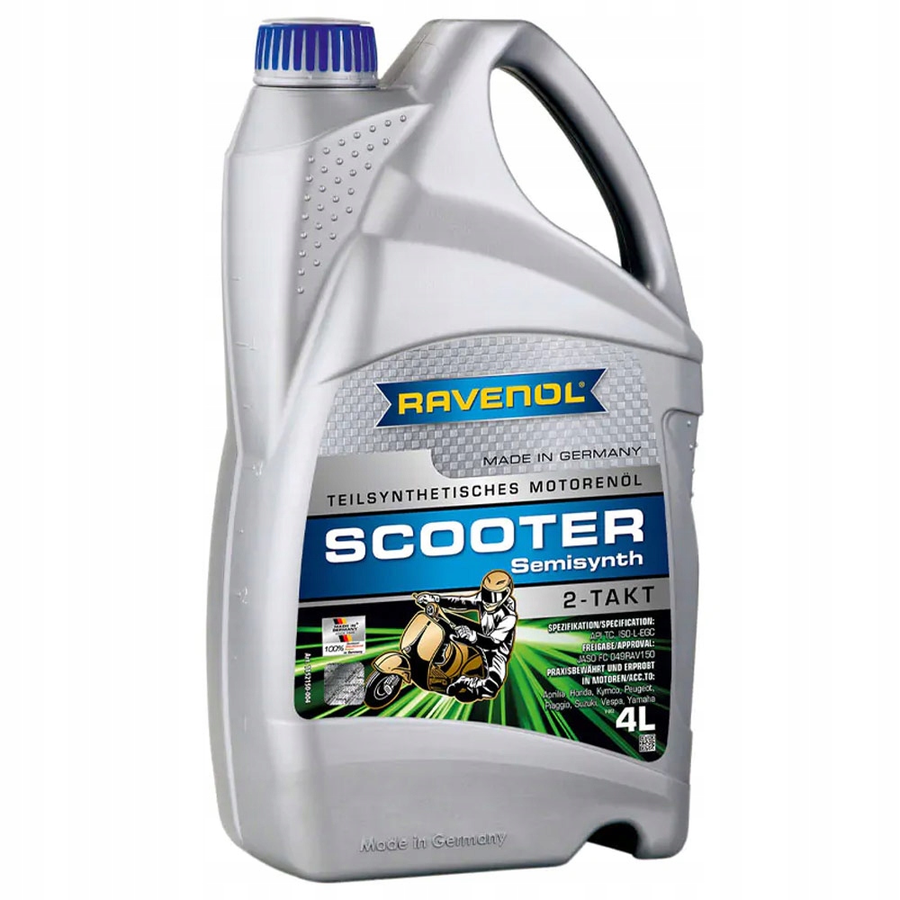 RAVENOL SCOOTER 2-Takt Semisynth - це високоякісна напівсинтетична «самозмішувальна» моторна олива, створена з комбінації спеціальних ефірів і PIB (поліізобутилену), на основі мінеральних і синтетичних масел з присадками для двотактних двигунів. які ефективно знижують вміст золи.