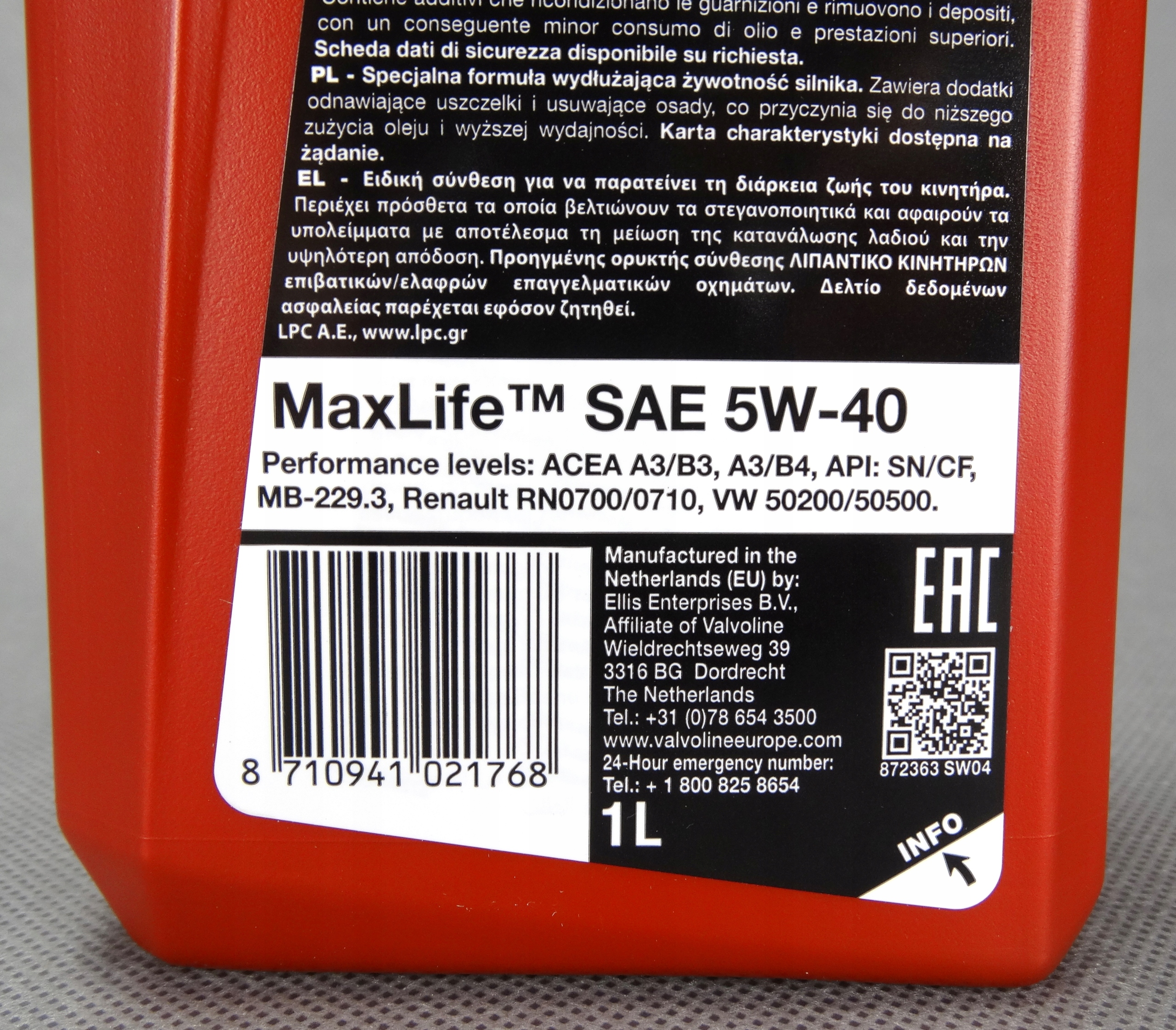 VALVOLINE MAXLIFE ENGINE OIL 5W40 - 1L