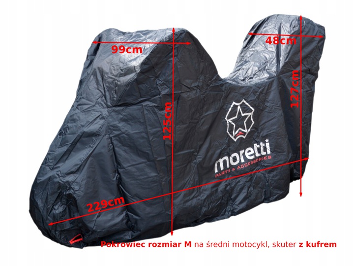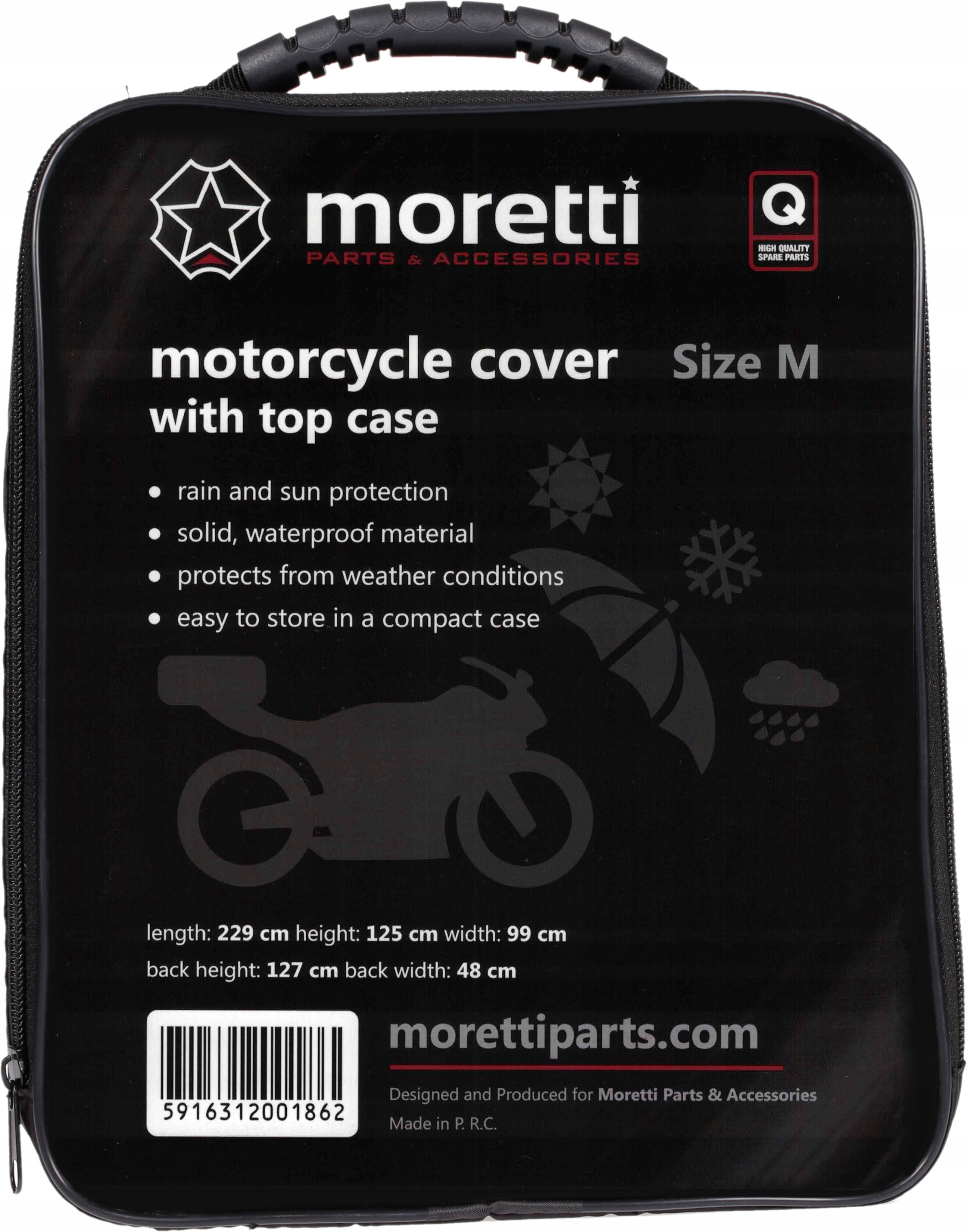 Дуже високоякісний мотоциклетний покрив відомого Моретті Моретті-М-м для мотоциклів та скутерів з кружкою, виготовленою з міцних і стійких до всіх атмосферних факторів. Обкладинка призначена для покриття всього мотоцикла, квадроцикла або скутера, включаючи дзеркала та колеса